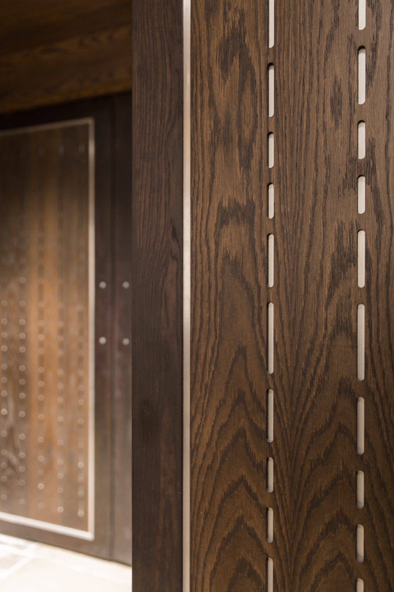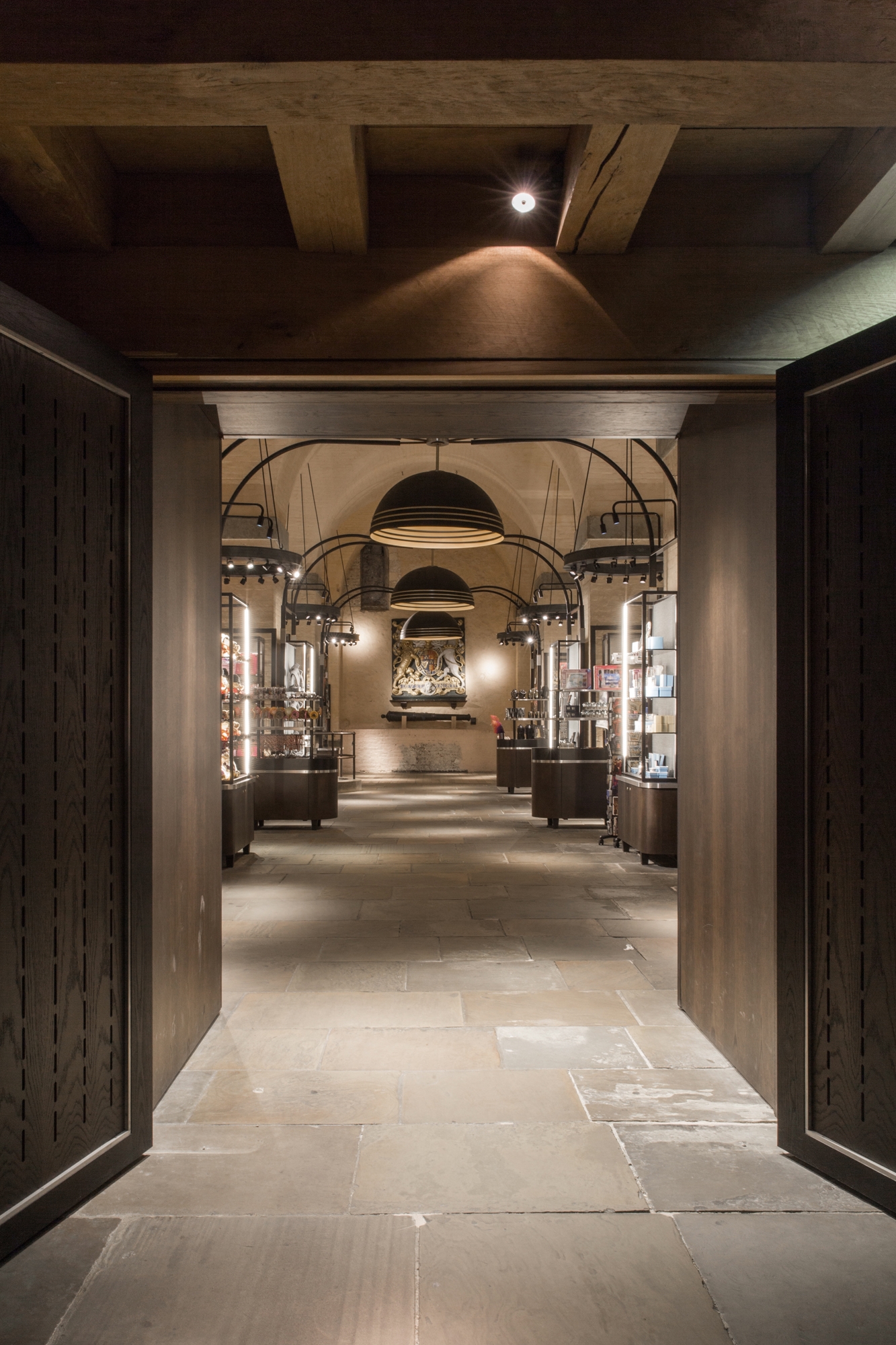 Dramatic down lighting creates a spotlight on the exit doors, signalling a clear navigational path to customers. The lighting also draws attention to the design detail of the oak doors, which are punched through to metal behind in a pattern inspired by the armour housed upstairs in the Tower. Both cash desks have been relocated closer to the exit and face each other in the rear alcoves, minimising any disruption caused by queuing.