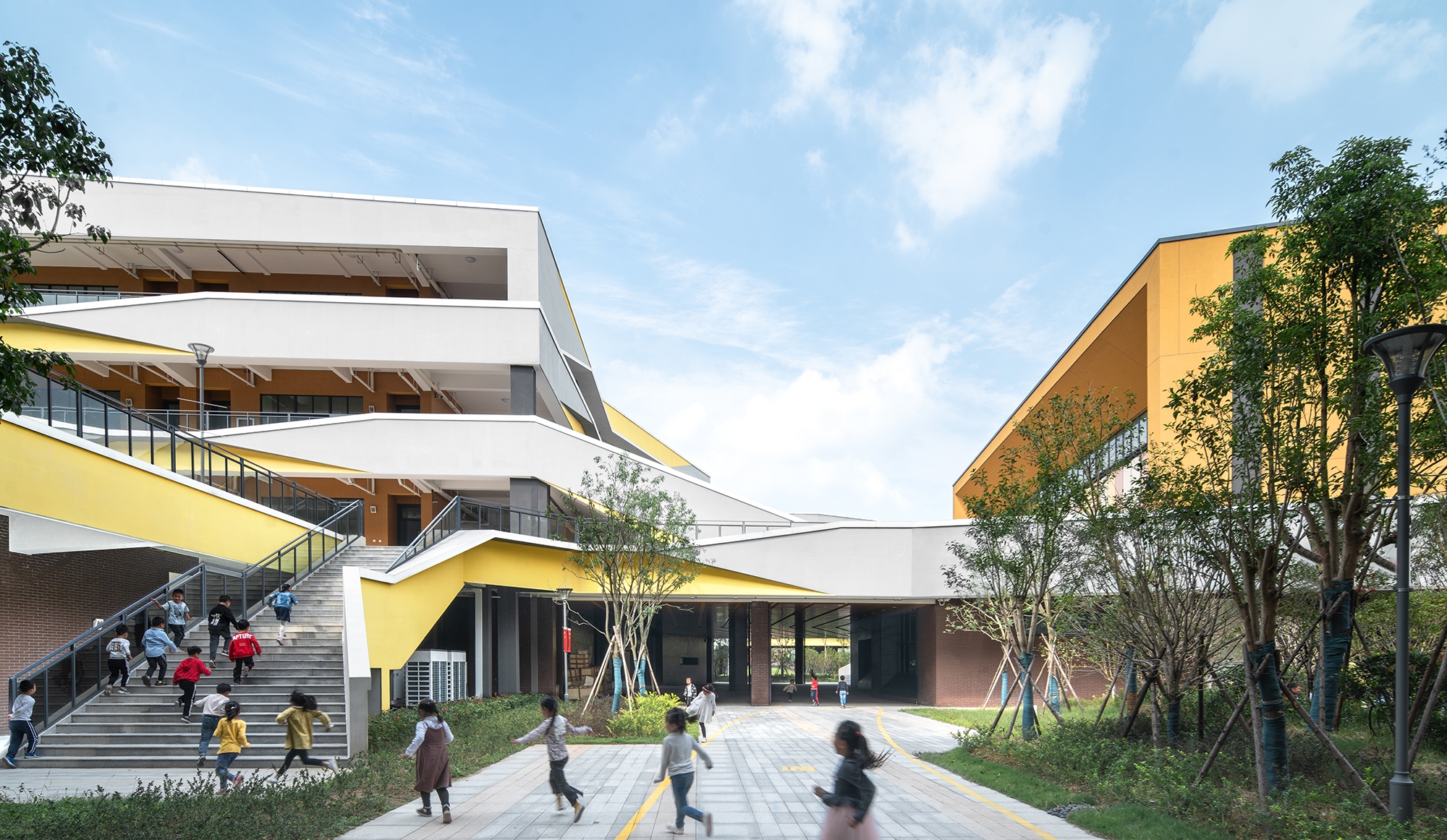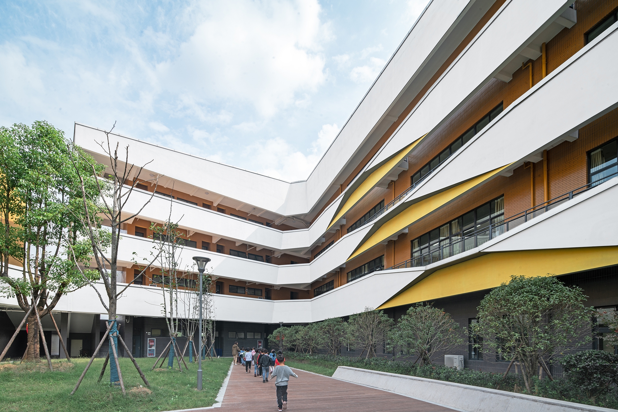 Because the courtyard mode not only can solve the strict requirements in this case but also has its irreplaceable advantages, architects choose this mode and add the theme element of "Enjoyment" to form the enjoyable learning courtyard in Yongjiang School.