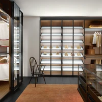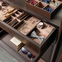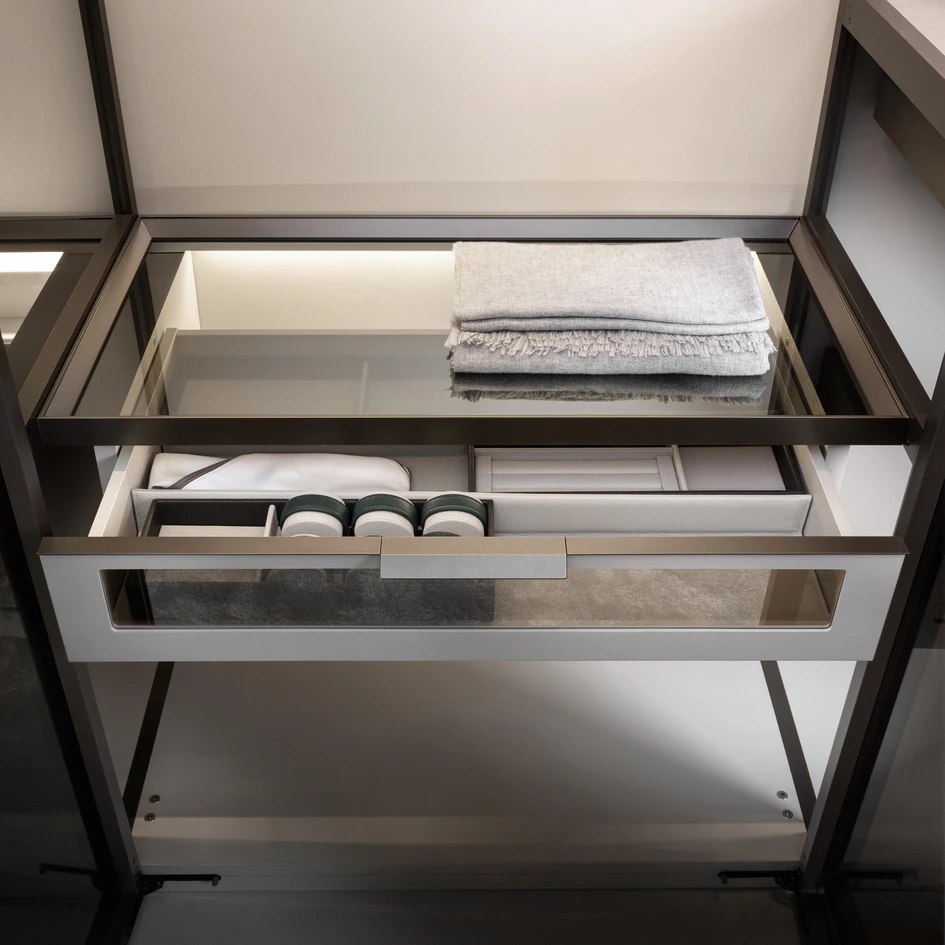 Talking of sliding, sliding doors protect clothes from dust and create a uniform aesthetic inside the room, while doing away with them altogether turns the space into an atmospheric clothes library, instantly filling the user with pleasure and excitement at the near-limitless outfit possibilities. Glass doors, like those in the Private range from Flou, can be a compromise between the two. The drawers, inserts and pull-out rails of the range, meanwhile, utilise depth to easily select both the smallest accessories and larger garments like coats and jackets.
