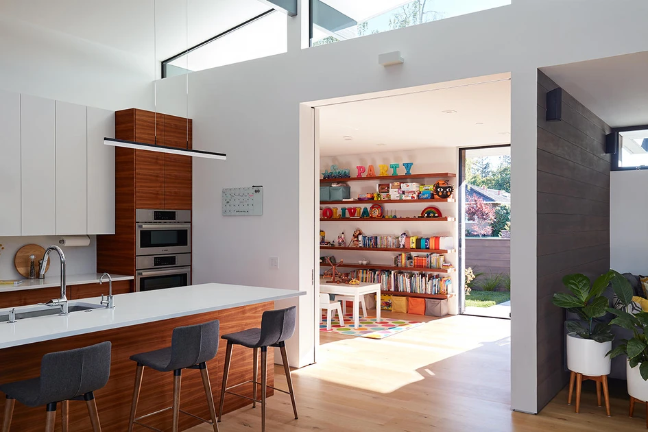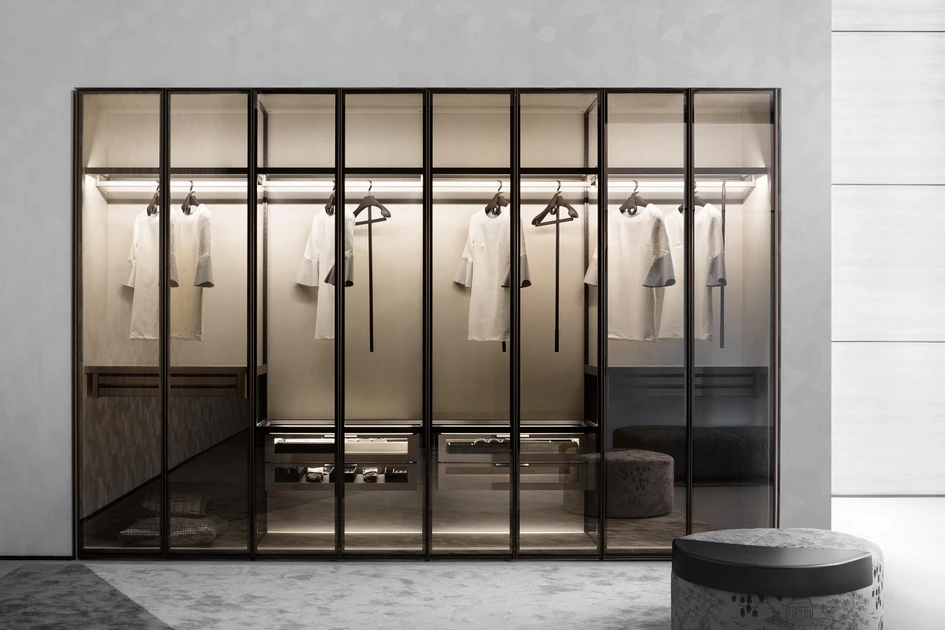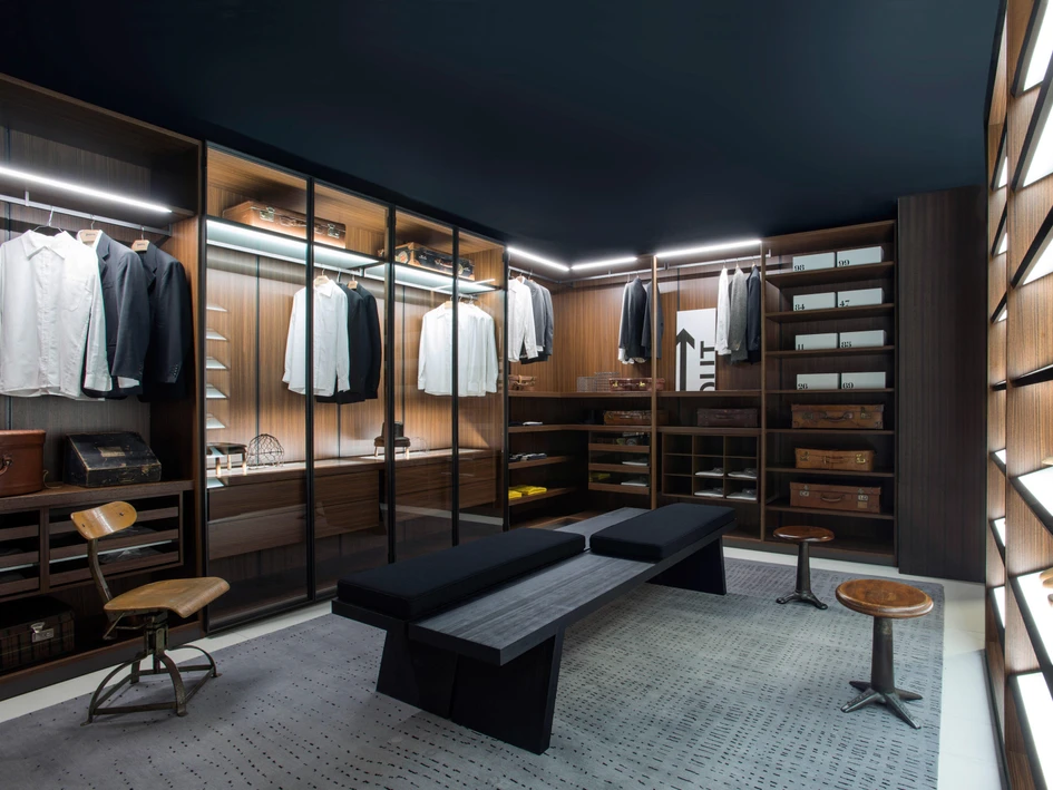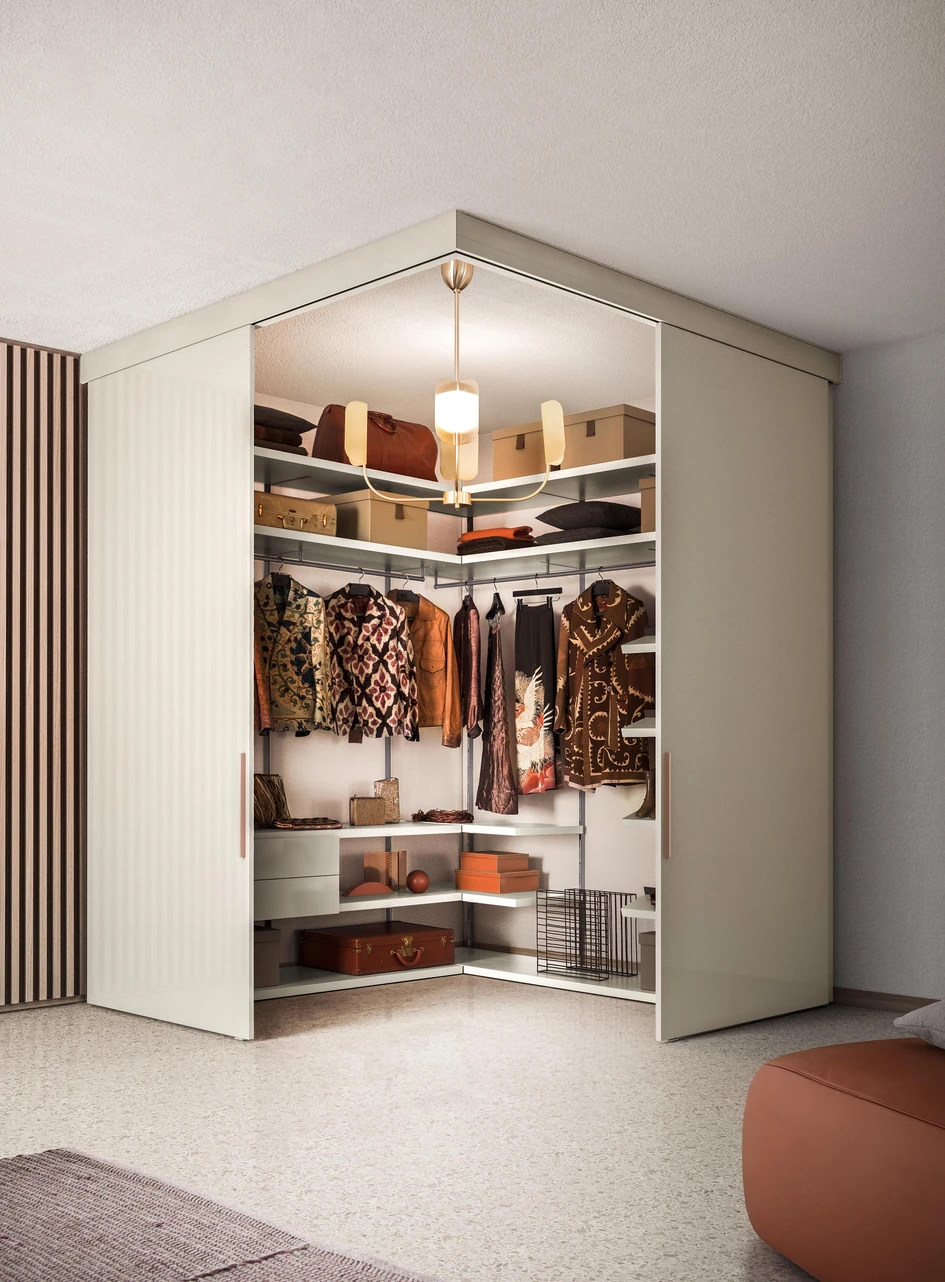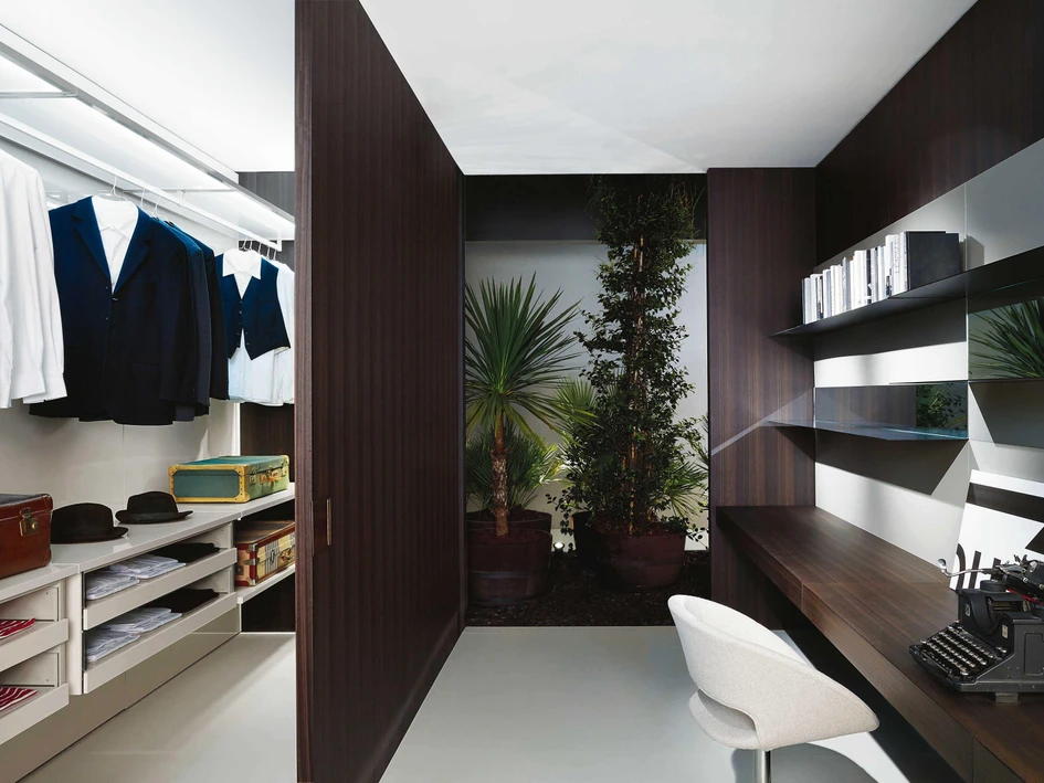 But what if the available space isn’t next to the bedroom, but rather somewhere else in the home? Hallway corners and alcoves, for example, can provide usable space to create walk-through wardrobes, like the Anteprima wardrobe does from Pianca, installed in an unused corner with sliding walls on a ceiling-fixed track. Or this example which uses Porro’s Storage Boiserie system to split a home office with sliding doors, forming a walk-in wardrobe on one side.