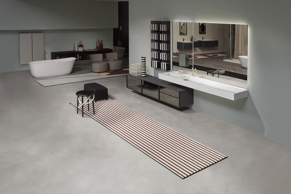 It’s not just what’s on a rug that changes how it’s used, of course, but also the shape of the rug itself. Long rectangular rugs or runners like Geometrie Volanti from antoniolupi can direct users through longer spaces like hallways, landings and the free space alongside a bed. But while rectilinear rugs are more common, homelier circular versions, like Moooi Carpets’ Walking on Clouds rug – which offers a new take on ‘weathered’ design, provide a contrast to square furniture layouts.