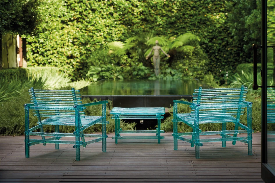 Composed of a chair, armchair, bench, sun lounger, coffee table and tables, the collection is marked by its linear arrangement of polycarbonate sticks crafted irregularly to obtain heterogeneous surfaces, which together create an elastic weave that provides maximum comfort and flawless resilience to the outdoor environment thanks to the durability of the material.
