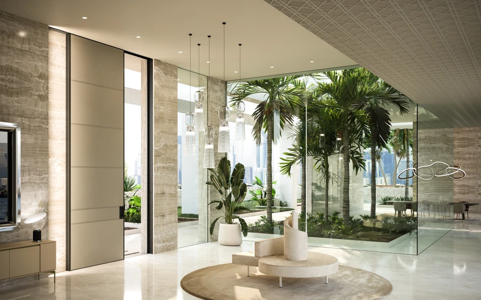 The engineering aspects of the Vela architectural solution are notable. There is an automatic lifting element, allowing the leaf to raise and lower when the door is opened or closed, for smooth movement. For heavier doors of over 120kg, magnetic levitation ensures the same perfect glide. The look of the system is stripped back as far as physics will allow: There is no threshold and rail, nor any visible screws. A patented floor locking system operates with an invisible safety mechanism.‘It symbolises the wind of change, shifting the paradigm of entry, proposing a new perspective’
