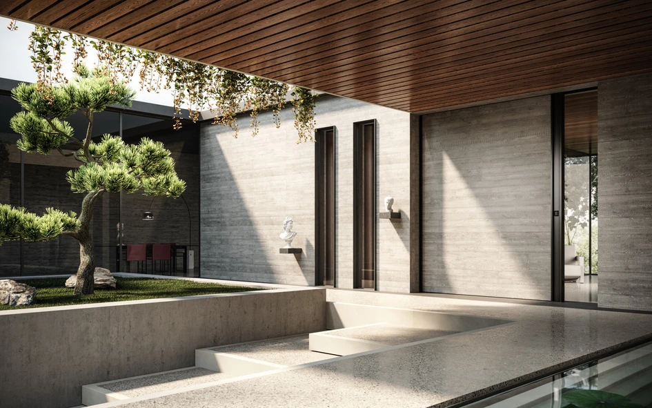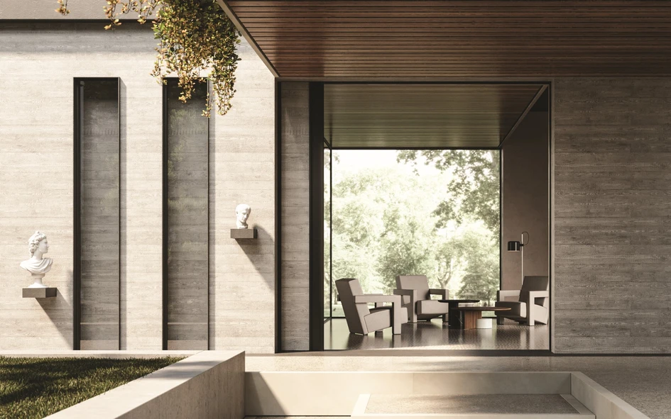 As an entry point to myriad building styles, Vela comes with a new series of grès porcelain finishes launched to complement it. Architects and designers can choose from neutral to intense and deep. As well as the existing variety of colors in a broad range of woods, lacquers and glass, there are new additions: Formwork Concrete in three nuances, Smooth Concrete in light and dark versions, and Metallic Iron. All of these finishes are being extended to the entire Oikos range of products.