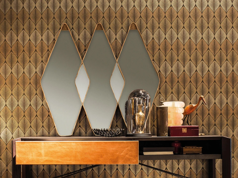 But modern mirrors don’t just use their frames to set them apart. The brass-or mocha-finished aluminium frames of Sovet’s Visual mirrors create unforgettable walls with various mirror tints including gold, rose, bronze and smoked, as well as clear. The Delta mirror from Black Tie, meanwhile, splits curved arrangements of bronzed, smoked and clear mirror glass and Emperador marble with gold-finished leading.