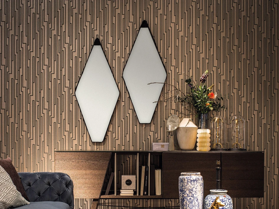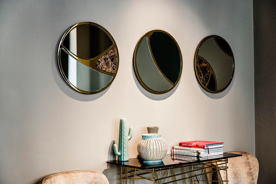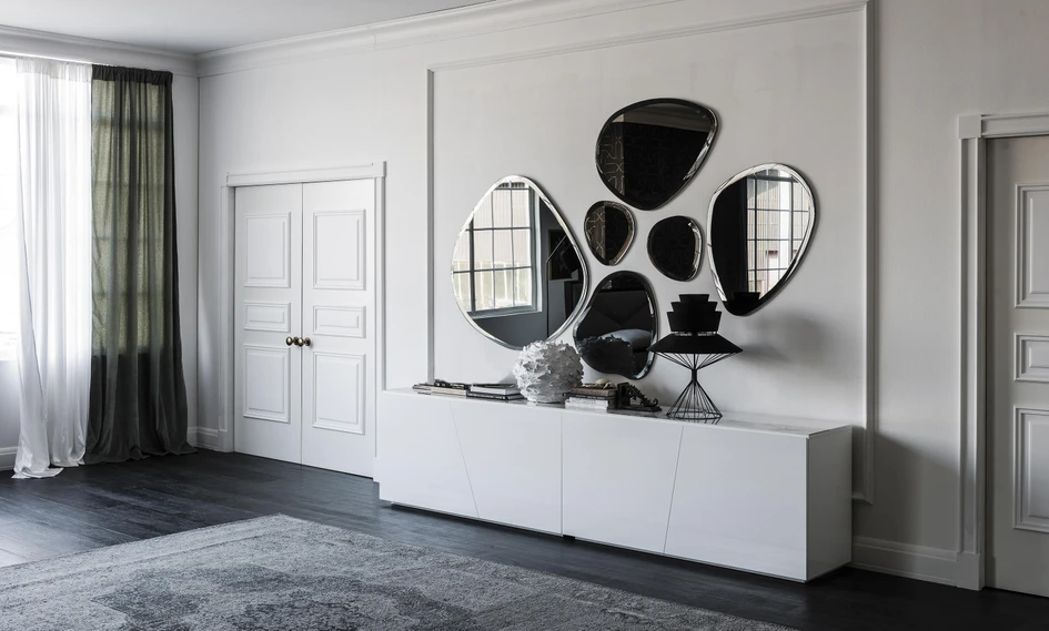 Arrangements of multiple smaller mirrors can still bring large-scale reflective function, however, only with an additional decorative side. For example, Cattelan Italia’s Hawaii mirror series, based on the US state’s major islands, seems to be slowly emerging from the stillness of the Pacific.