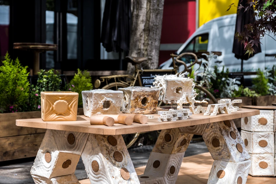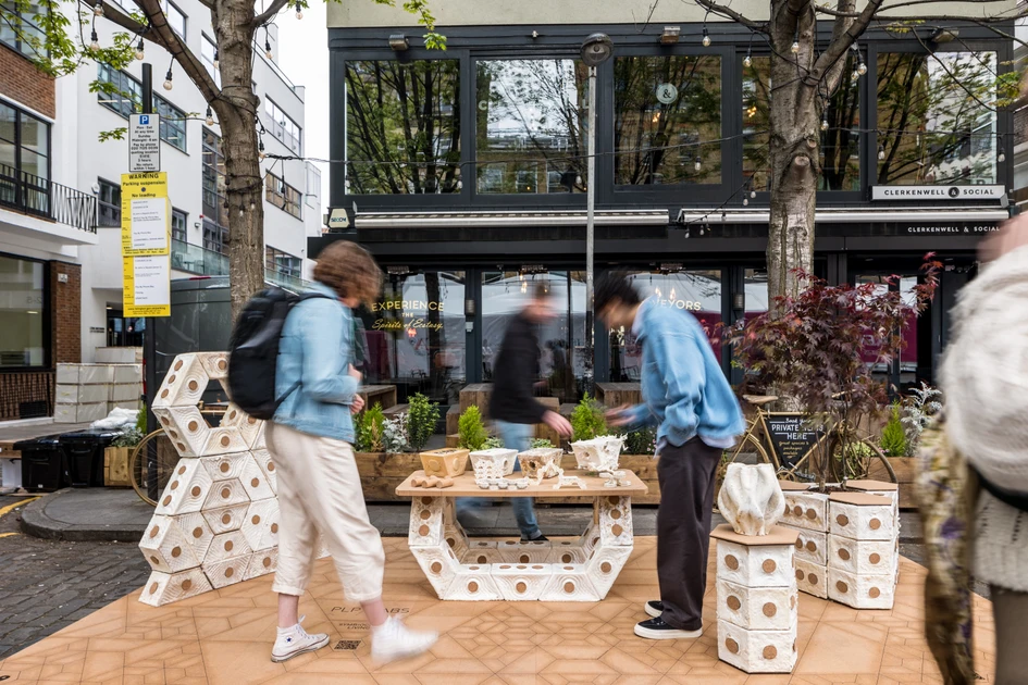 One of the most popular stops on the official tour of Clerkenwell Design Week, was the Symbiocene Living installation by PLP Architecture. Working to ensure ‘humans and nature do not just exist in harmony, but actively collaborate to build a better world,’ explain the research-based architecture practice, the project seeks to familiarise the public with fungi architecture.Thanks to continuing research into the architectural properties of mycelium, the studio has developed a 3D-printed timber shell that holds the fungal colony in place and also helps to connect the watermelon-sized building blocks together. Although not currently up to load-bearing capacity, researchers hope to continue development to open up the use of mycelium as a multi-storey building material in the future.