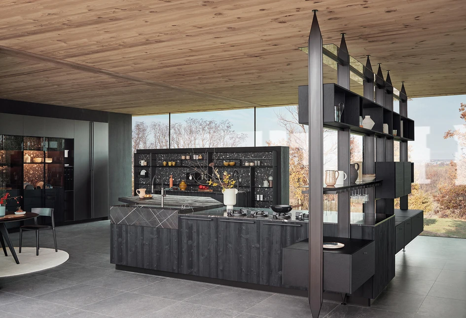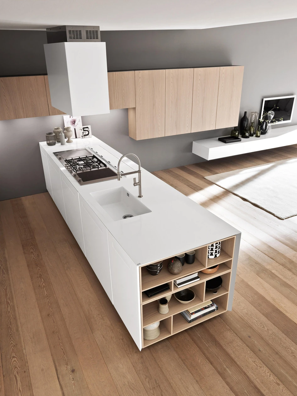 With the underside of kitchen islands featuring either storage or seating, the edges are often blank canvases on which to project a user’s personality.The counter itself can fold down to create a striking waterfall worktop, especially stunning here in Cesar’s N_Elle kitchen island in dark marble. Alternatively, the counter can overhang free space on two or three sides, for an L- or even U-shaped breakfast bar, such as the Monolite kitchen island does, by SCIC. Or, the edge can be used as segregated storage, as seen here with Sintesi.30 by Comprex. Perfect for keeping favourite cookbooks within easy reach.