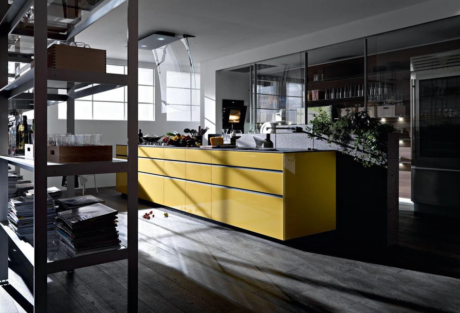 By installing a hung shelf, as Dada has with its Hi-Line 6 island, essential ingredients, metalware and glassware can be stored above preparation space, hobs andKitchen island lighting