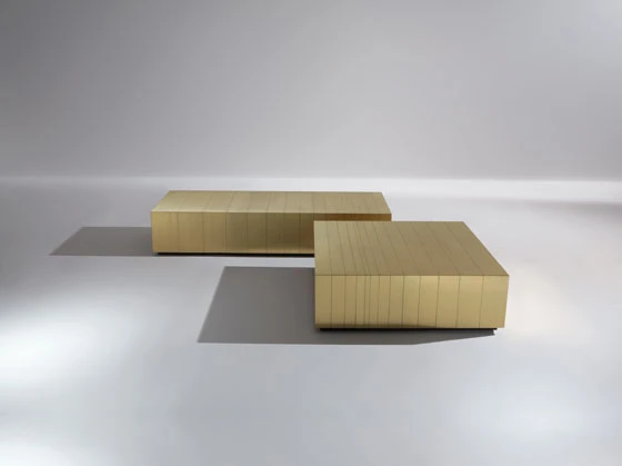 An exemplary ‘surface design’ collection is Stars. Designed by Bartoli Design, it comprises a variety of brutally simple furniture forms, enlivened with metal panels that are divided into increasing and decreasing sequences of rectangles. Each rectangle has undergone hand-finishing to enhance the polished steel, natural brass, burnished copper or natural copper material options. The result is a surface design that is different every time, meaning no two products are the same, as the finishing process can result in a totally different tonal effect.