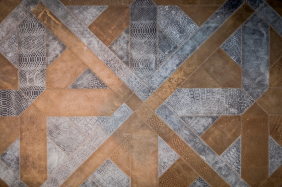 Alphenberg offers several different ranges of leather for walls, floors and upholstery, from the mottled light and dark patina of the Tundra range, through the distressed effects of the Pampas, to the shiny, smooth finish of the Tuscany series. The ranges and collections differ mainly in terms of colour, texture and size or shape of the tile, says Koemans, and can also be produced in different thicknesses depending on whether they are being used for a wall or for a floor.