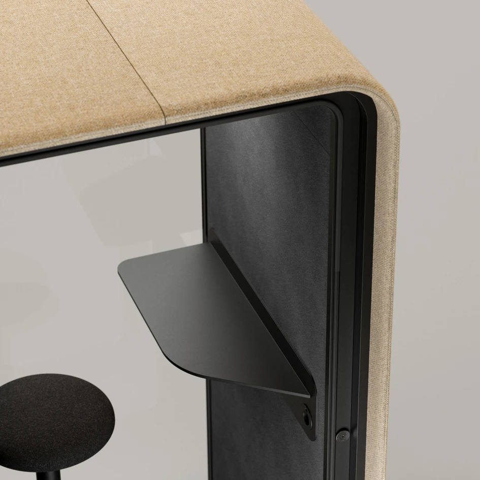 PodBooth is also designed to be aesthetically pleasing — and unimposing. Like all Pod products, it can be customised to blend seamlessly with any environment since it is made from a palette of materials that includes a wide choice of monochrome fabrics, wood and laminates. Its tautly upholstered exterior — also a sound-absorbing acoustic surface — can be made from fabrics that harmonise with any existing colour scheme. These come in natural shades such as blue, beige and brown, all soothing to the eye, further promoting wellbeing. PodBooth’s rounded, organic corners also give it a soft, visually restful quality. What’s more, its neutral aesthetic ensures that it won’t date easily, rendering it sustainable.
