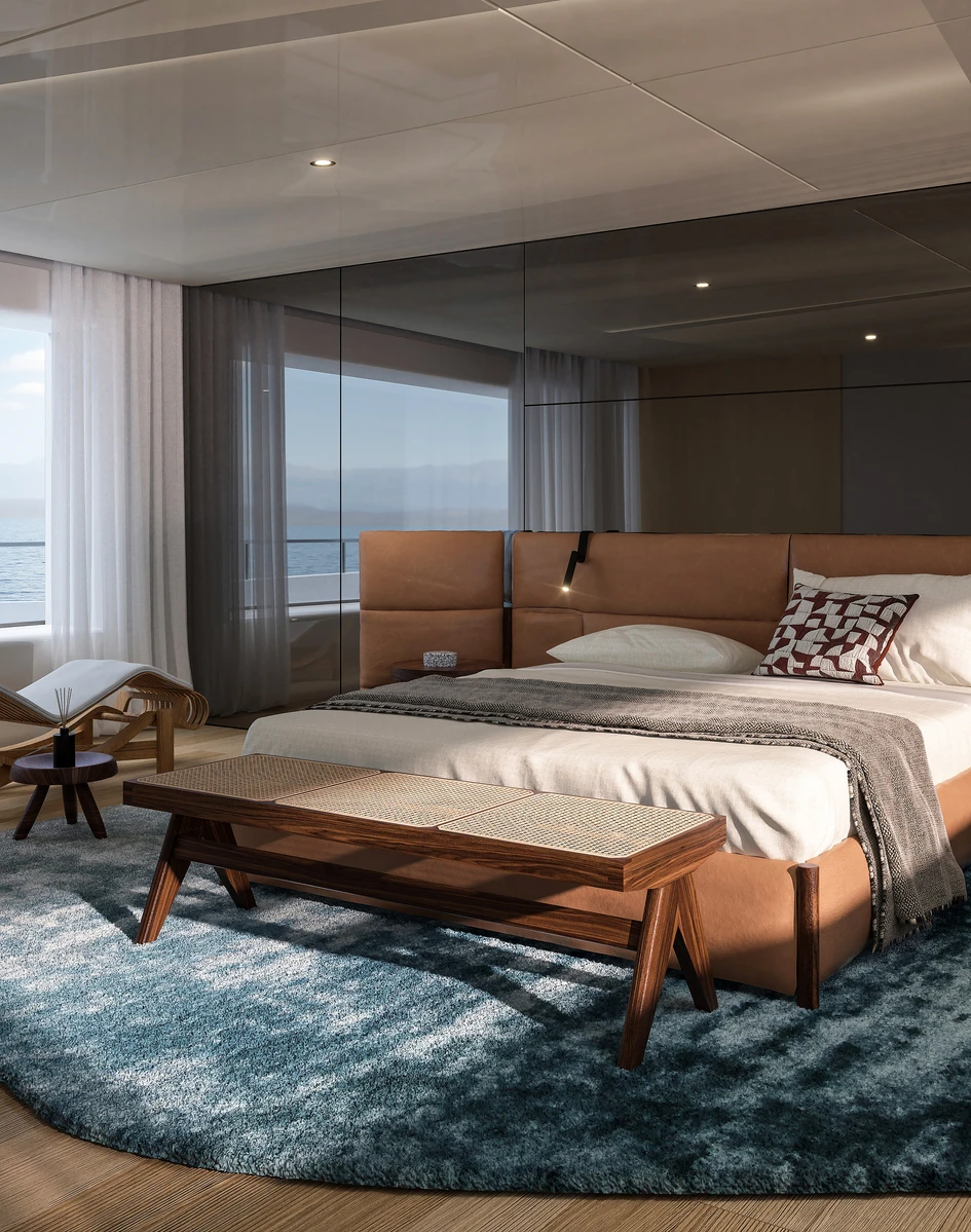 Cassina LAB prioritises well-being and has implemented functions that can enhance sleeping areas such as a boat’s cabins. Both the Bio-mbo bed by Patricia Urquiola and the Volage EX-S Night bed by Philippe Starck can be provided with the Breath® air-purifying fabric, the first patented zero-emission technology for air purification that captures and breaks down contaminants to encourage the natural circulation of clean air, and sound-absorbing panels to improve the room’s acoustic performance. With these groundbreaking designs, Cassina is charting a course for a healthier and more sustainable future.