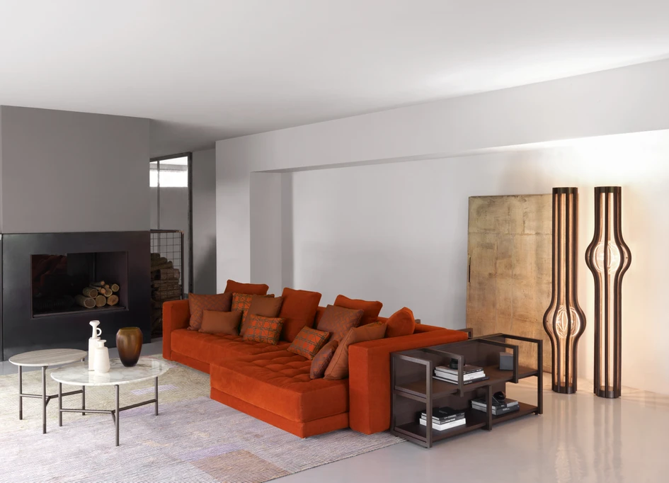 This softer shade of white, combined with a neutral palette of cream and grey, creates a bright base for Flou’s bold designs and two rich, feature pigments for its textiles – pumpkin orange and forest green. “The white base becomes a platform to highlight the intrinsic value of the products, creating a dynamic and surprising experience,” explains Messina.