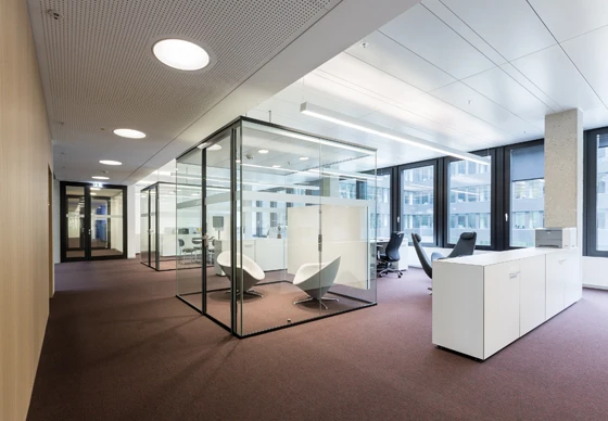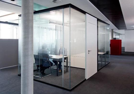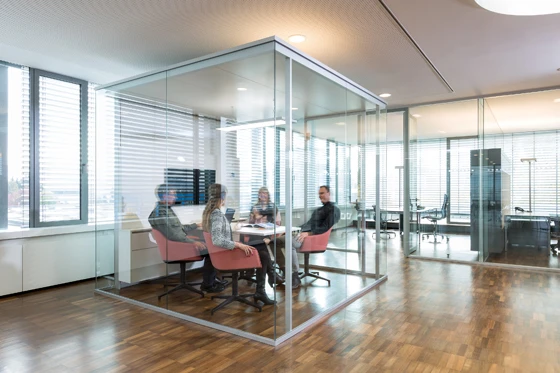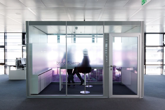 The all-glass Kubus imports transparent retreat areas into large office spaces. The elegant aluminium structure of Kubus I with its all-glass design flush to the outside fits smoothly into the existing architecture.
