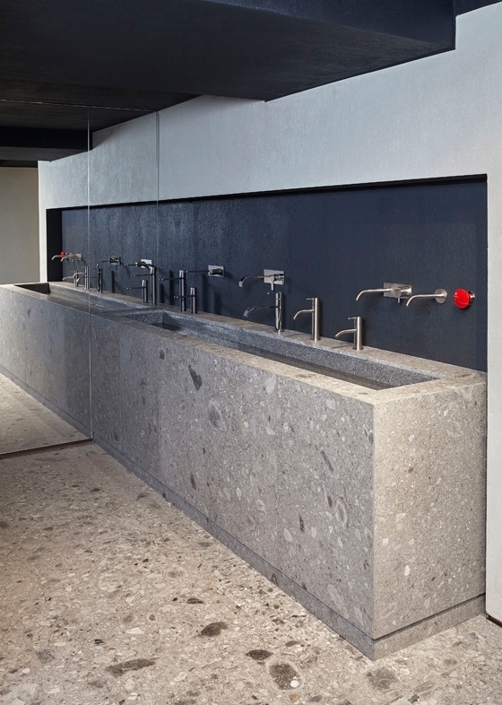 While the showroom’s design is highly considered, the overall impression it creates is of simplicity. This is no accident: it was important that the redesigned space was also neutral, not too dominant, placing the main focus on the products. To this end, finishes are sober and homogeneous, although some are textured. Large-grained cement plasters, for example, line the walls. The floor is made of a local, grey-blue stone called Ceppo di Grè, which has been used in Milanese architecture since Roman times — adding a further cultural layer to the project.