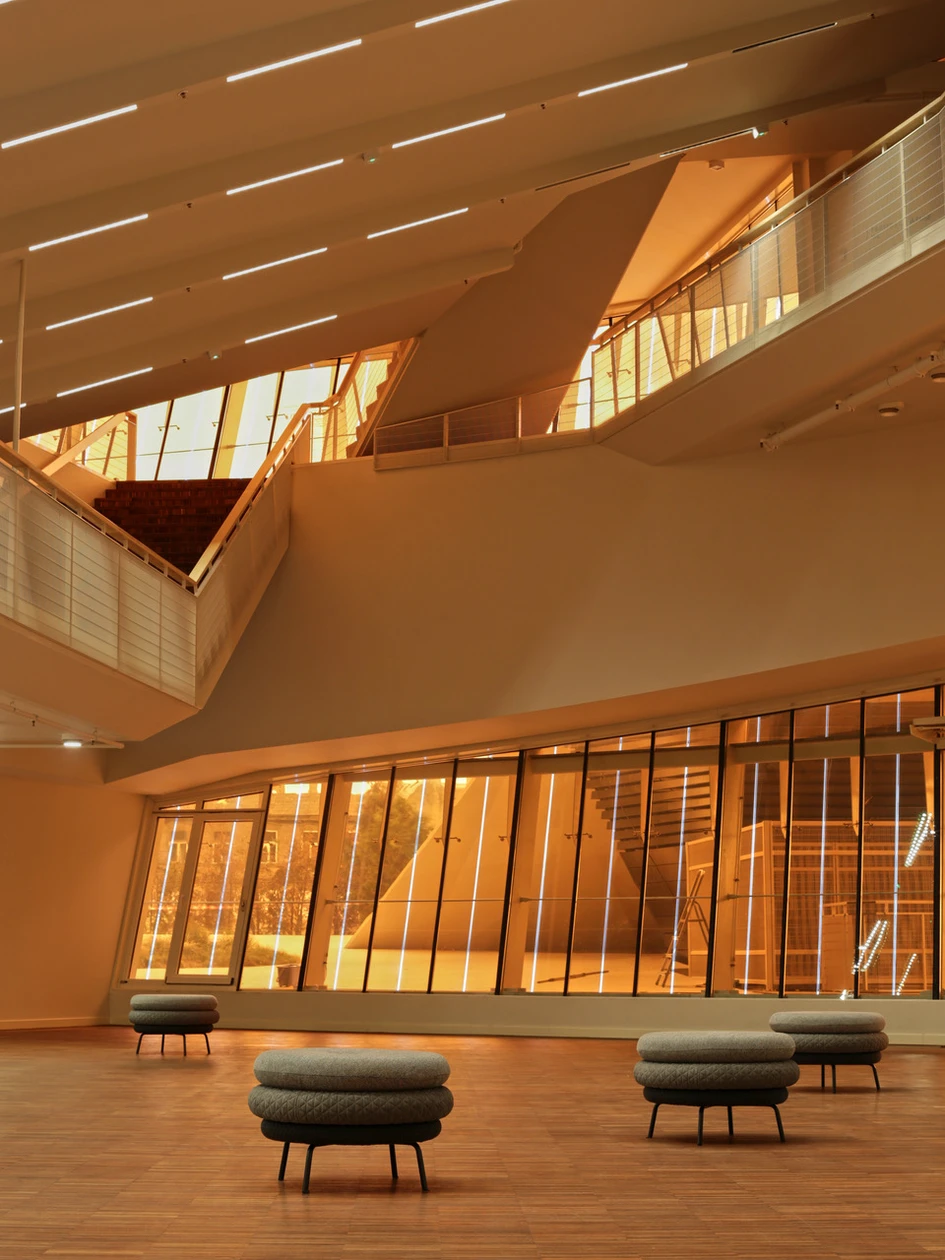 A whole family has now grown out of this, ranging from small stools, via a range of tables to different types of pouffe. Common to all of them is their round form and how they play with material and colour. Areas of application are diverse. For example, the Fat Toms can be found in ‘The Great Amber’ concert hall in Liepaja, Latvia, the largest concert hall in the Baltic States. Designed by the architects Volker Giencke & Company, the Latvian architect Martins Pilens chose the pouffes to furnish the public areas, creating islands of fabric within the building.