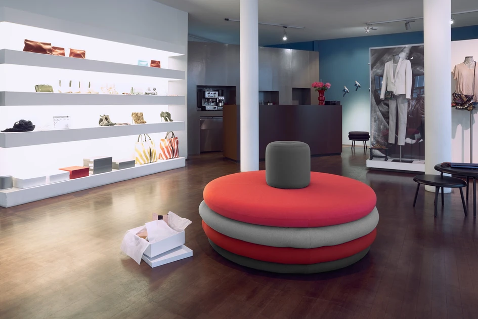 One such distinctive piece is the Island Tom by Alexander Seifried, an item of contract furniture that reflects Richard Lampert's interest in unusual designs. Island Tom consists of stacked, round seating cushions that can be covered in a wide variety of colour and material combinations.