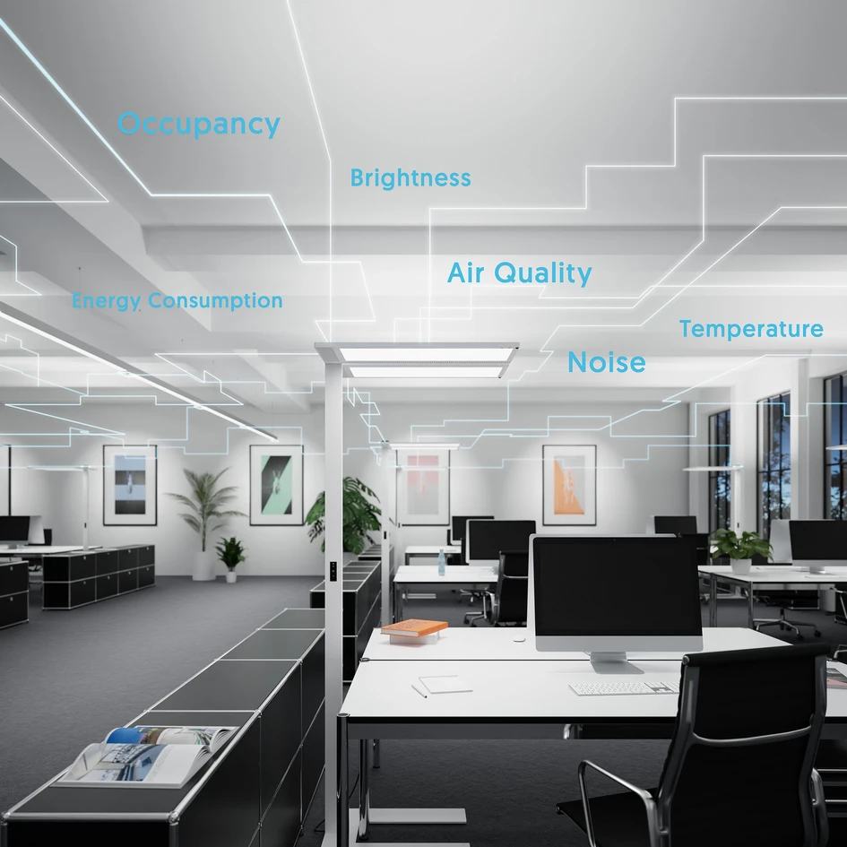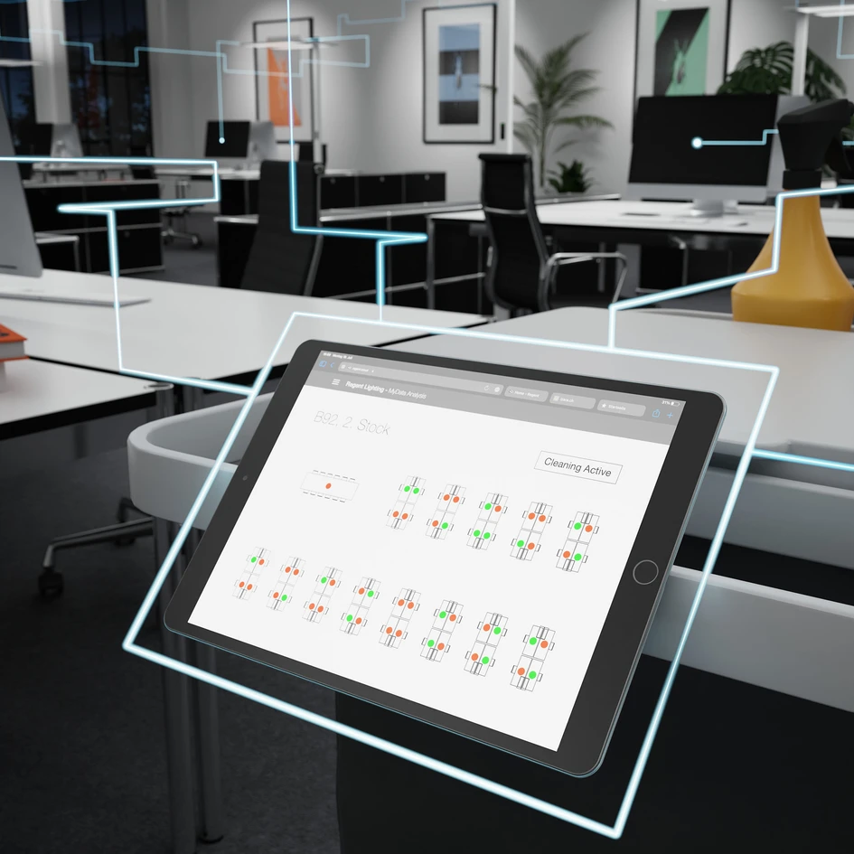 A large company in Germany that works on international projects uses MyData Analysis to reduce operating costs, for example, where cleaning is concerned. Through the ‘Cleaning’ light function that can be activated, only the workplaces that need to be cleaned become illuminated. In this way, ’Smart Cleaning’ saves time, costs and resources. The basis for this is real-time data from the relevant areas. Sensors integrated into the freestanding luminaires collect data such as usage time, temperature, humidity and air quality in the office.