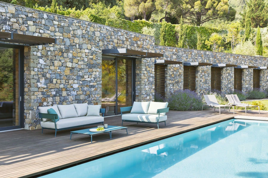 Minimising waste in the manufacturing process of course isn’t the only responsible course of action. Questioning the need for newness in the first place and manufacturing things to last are considerations of equal importance. Longevity is now a key element of the Fast proposition and addressed in the timelessness of new design, as in the case of the sleek and elegant loungers by Emmanuel Gallina and the clean graphic lines of the Radice Quadra tables by Robby Cantarutti & Partners, alongside improved functionality; the life-lengthening waterproofing technology incorporated into the Aikana cushions, for example, is a game-changer.