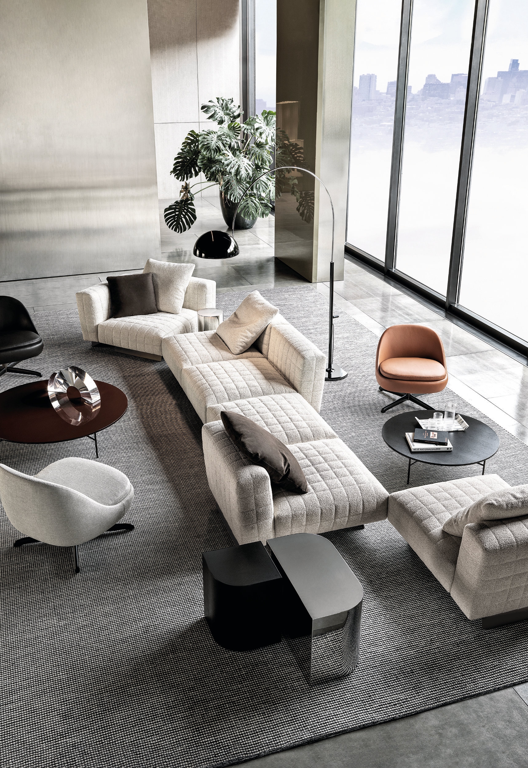 Designed by Rodolfo Dordoni, long-time Minotti art director, Twiggy takes its name from the homonymous ‘rebel icon’: the era-defining British model from the 1960s. Born as a precocious single, bold armchair (available in three versions – small, large and deep, and with or without armrests) – which demanded attention, sculpted space and oozed elegance, Twiggy now offers a dynamic modular system. Every detail, from its aluminium base to its chequered embellished stitching, evokes Minotti’s absolute technical know-how and its sophisticated sartorial approach.