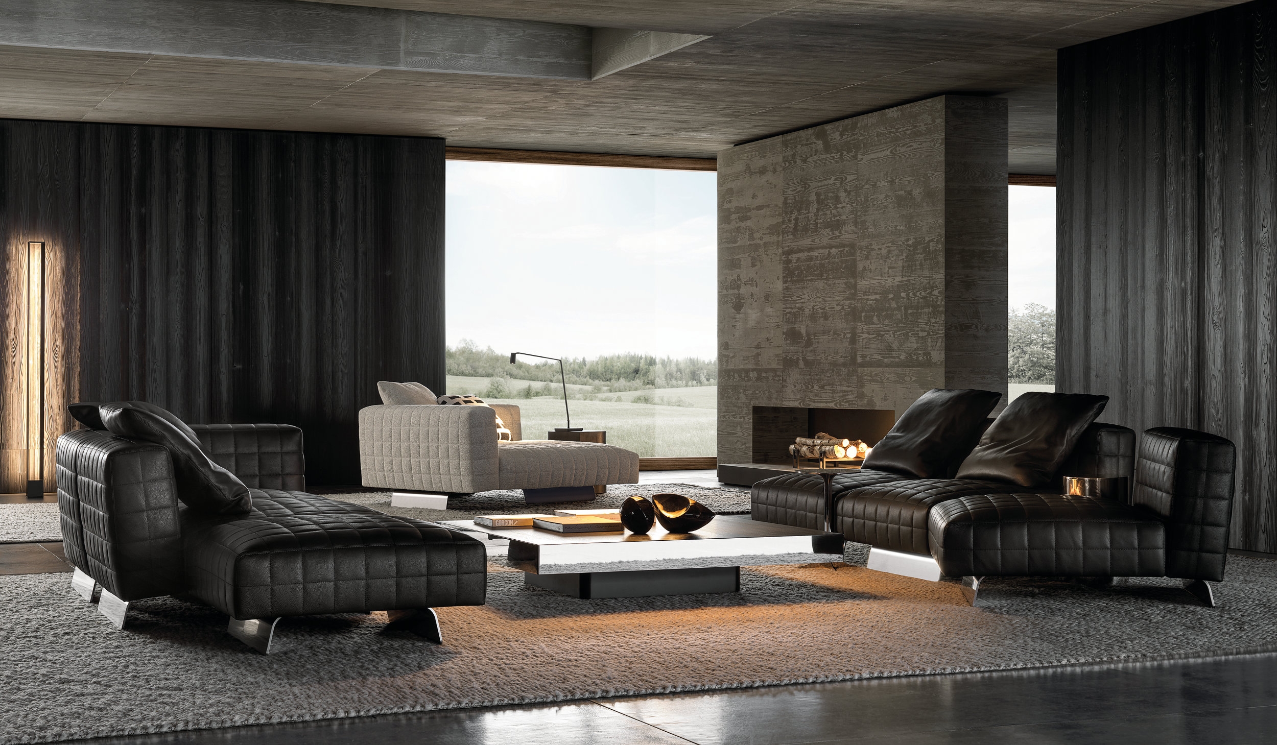 Twiggy’s formal geometry and chequered quilting both contribute to its ability to sculpt space. It performs as a secondary architecture that is flexible and responsive to living. The architectural forms ‘cut’ and ‘shape’ space to open up social potential. A corner module provides an anchor for an alcove where an individual might retreat to reflect, while a combination of modules becomes an anchoring island for an open-plan interior.It’s important, though, to know that this iconic and sculptural presence goes hand-in-hand with Twiggy’s comfortable embrace. Though geometric, each seat element is also softly enveloping – covered in leather, nubuck or fabric and textured with the embellishment of refined stitching. Available with a Black Coffee-coloured polished varnish or with a brushed, semi-polished finish, the aluminium base brings out natural nuances of craft, tactility and individuality.
