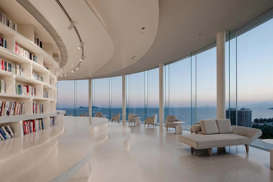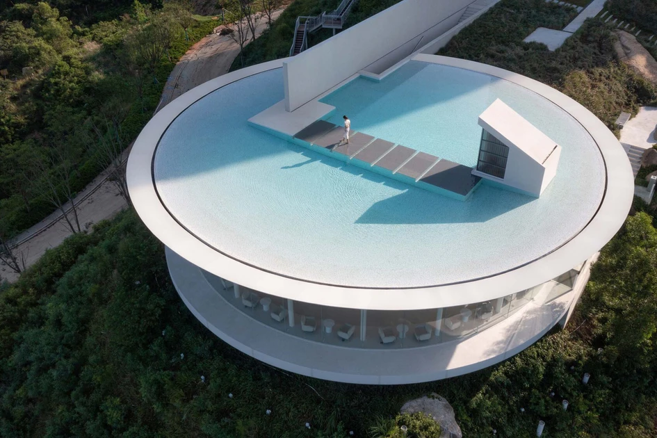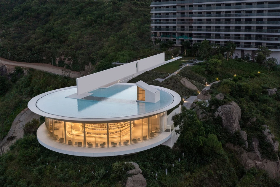 Set on the edge of a ‘peninsula-shaped hill’ as 3andwich Design / He Wei Studio describe it, The Water Drop Library looks out over the Shuangyue Bay Turtle Reserve. By sinking the main body of the structure beneath the drop of the hill and shielding its surface with a rooftop pool, the view of the bay from the residential buildings behind is unobstructed.Visitors are shocked into stunned silence by the flat horizon