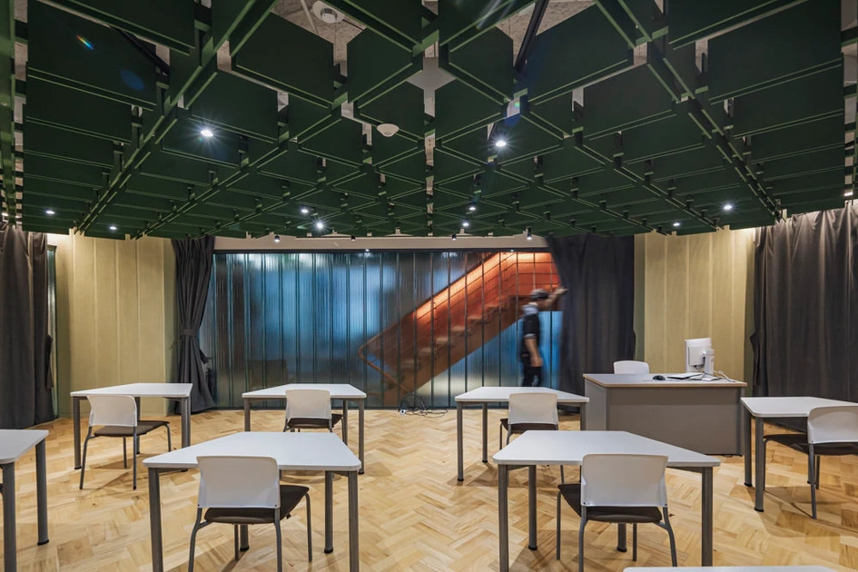 The Goethe-Institut is an international non-profit organisation that promotes the study of the German language and encourages cultural exchange and relations with other countries throughout the world. However, unlike in Germany’s north-European climate, the Goethe-Institut in Bogotá faces Colombia’s tropical one and so chooses to keep spaces open instead, ‘removing the divisions to allow for greater circulation,’ as explain Yemail Architecture.Ceiling baffles above each area ensure sound is unable to travel far