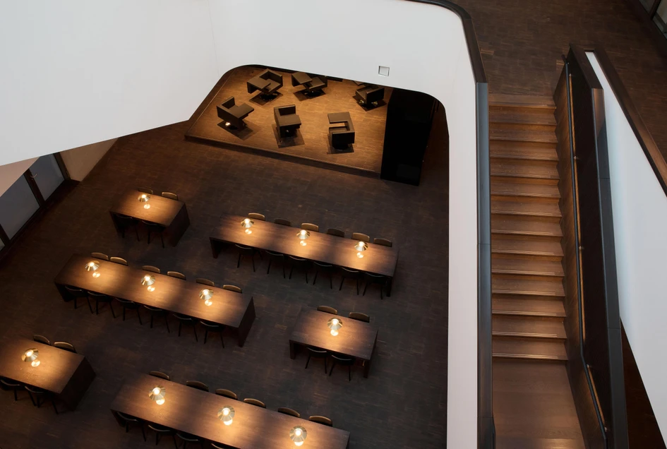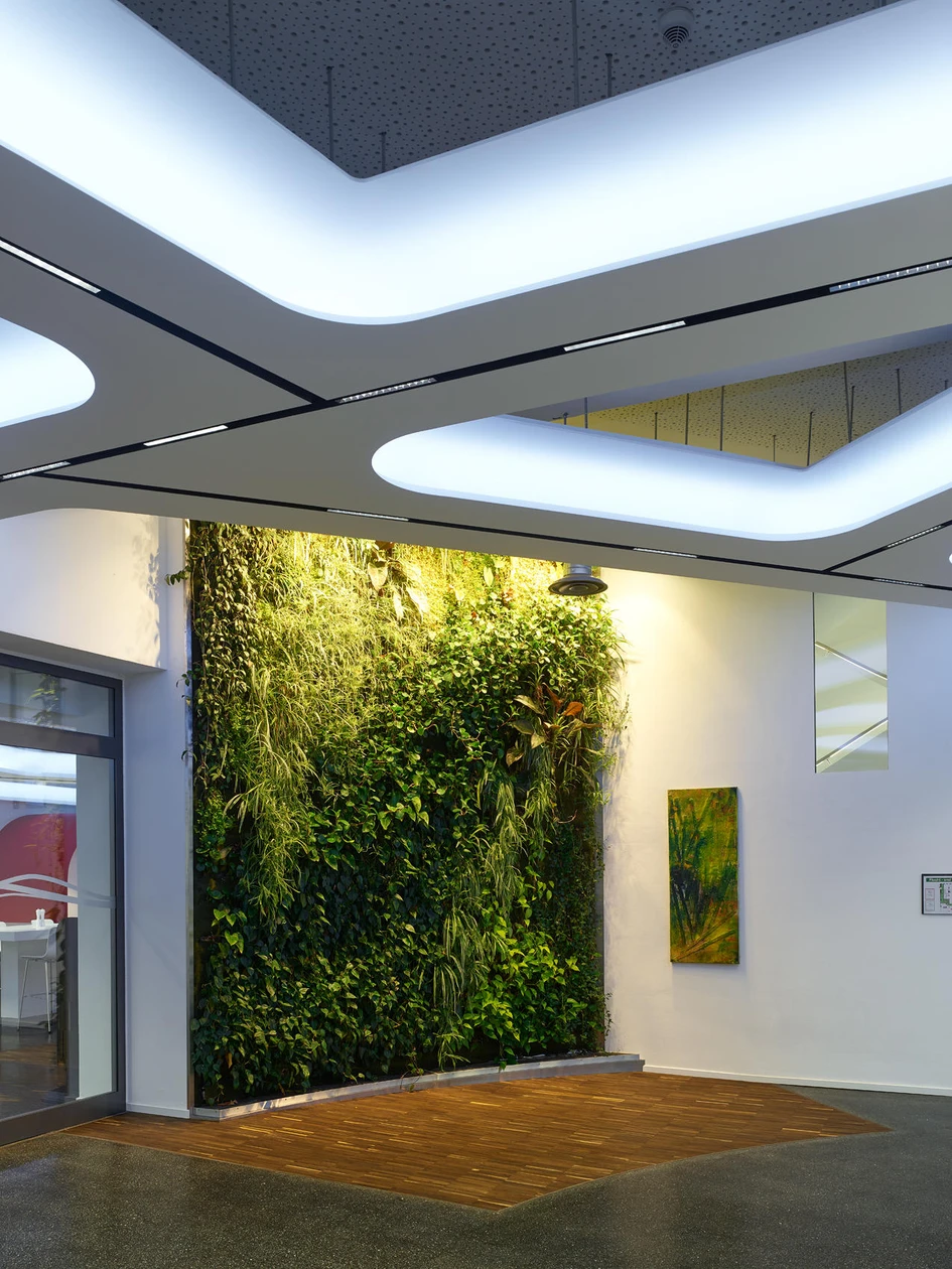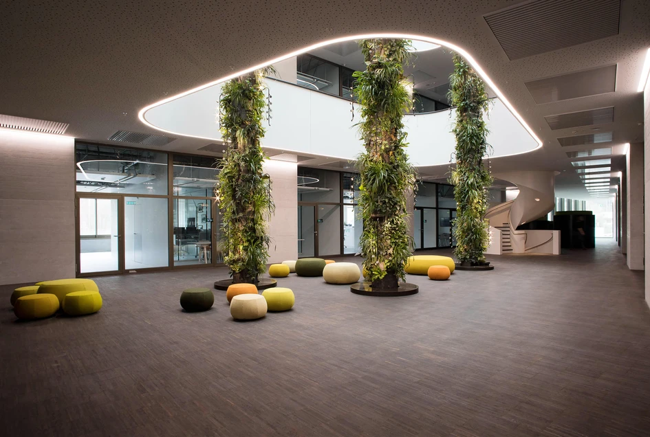 A bespoke interior lighting scheme was also designed for Zurich Innovation Center Givaudan by Lightsphere. The workspaces are clustered around a generous, day-lit atrium that features freestanding planted pillars. Lines of light trace the balconies and staircases, while discreet, specialist luminaires that promote plant growth are attached to the green columns. The breakout spaces include more informal, brightly lit clusters of colourful poufs that are complemented by rows of library-style study places and booths with individual lighting armatures elsewhere in the building.