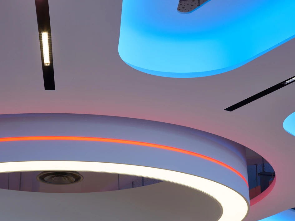 In Bochum, Germany, Tobias Link designed a new interior lighting scheme for the offices of the cybersecurity company G Data. Link designed a web-like network of sound-absorbing elements with integrated white LEDs, which illuminate the space directly. Recessed and adjustable RGB lights illuminate the sides of these suspended beams, creating ever-changing colour displays. There are some notable exceptions to this scheme – more conventional floodlight armatures are used in the canteen and the employee auditorium, while the company café features timber ceiling elements and adds minimalist pendant lights to create a more relaxed and casual atmosphere.