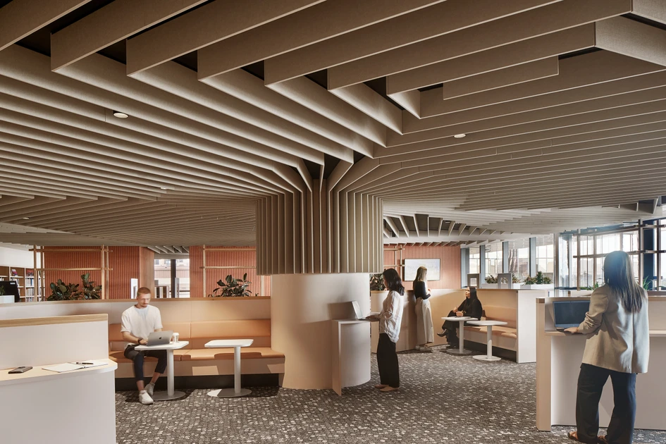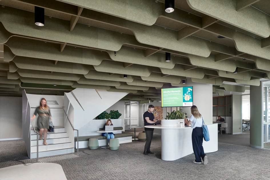 “The EchoPanel Array ceilings define the interactive and student-led zones throughout the vertical campus. These soft, sculptural canopies provide a sense of arrival at each floor, immersing the visitor in an engaging educational environment with strong visual impact.” - Daniel Stanning, Associate & Senior Interior Designer at Architectus.