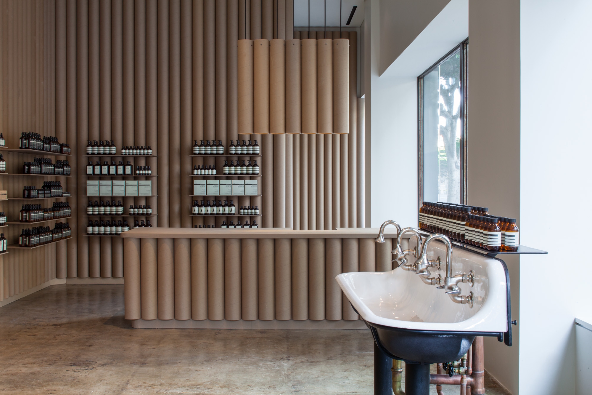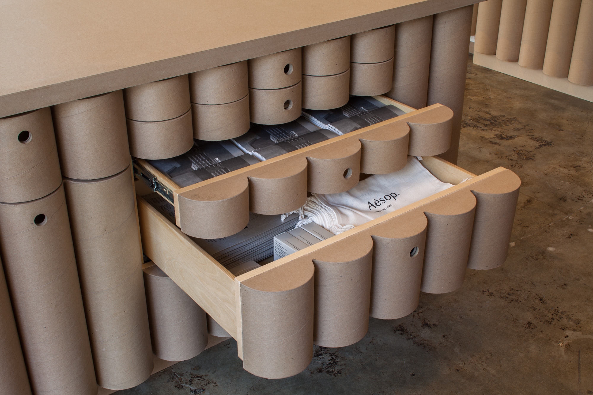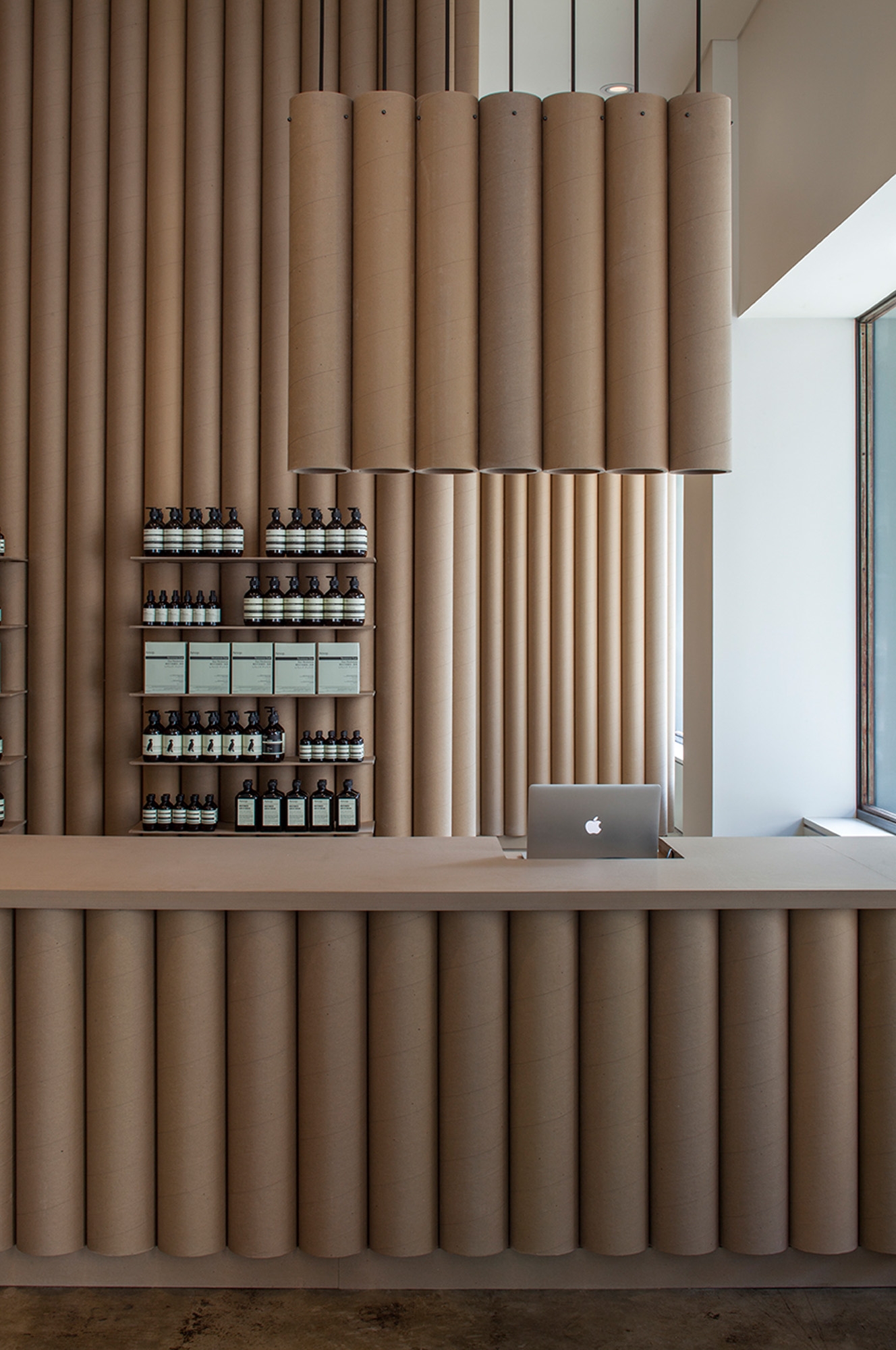 Countertops are made of recycled paper, complimenting the cardboard tube wall finish. Product esting sinks are of a vintage style and floors are the natural concrete of the 1929 historic building. A long storefront captures a view of the busy street and projects a comfortable and unobtrusive space, inviting those outside to enter.