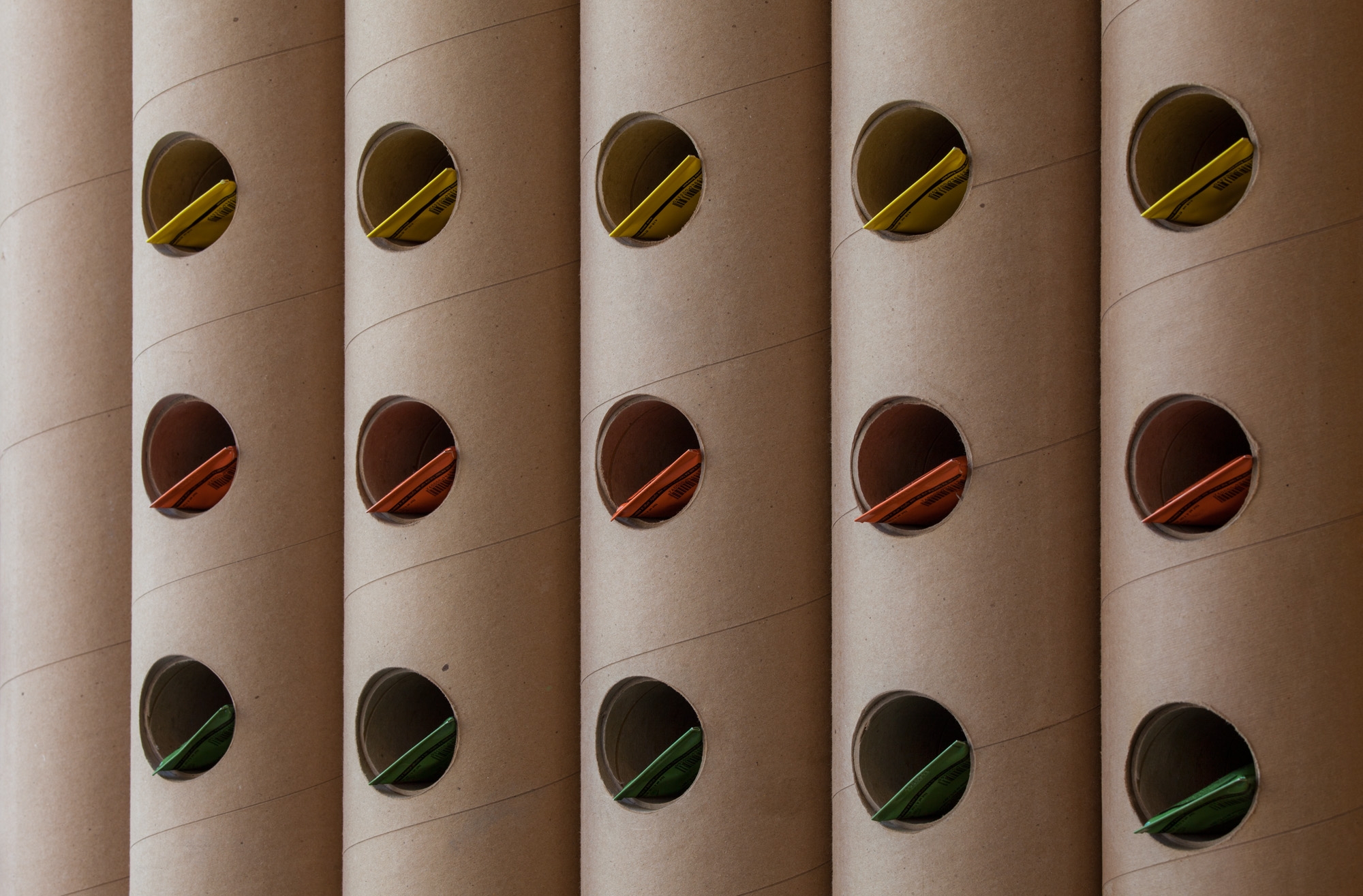 Taking cue from the neighborhood culture and the empty bolts of fabric strewn about costume shops and fashion houses, the environment consists of 6-inch round cardboard tubes to create walls and furniture. This natural palette is warm and inviting, projecting a soft glow to the store’s interior and onto the street and sidewalk.