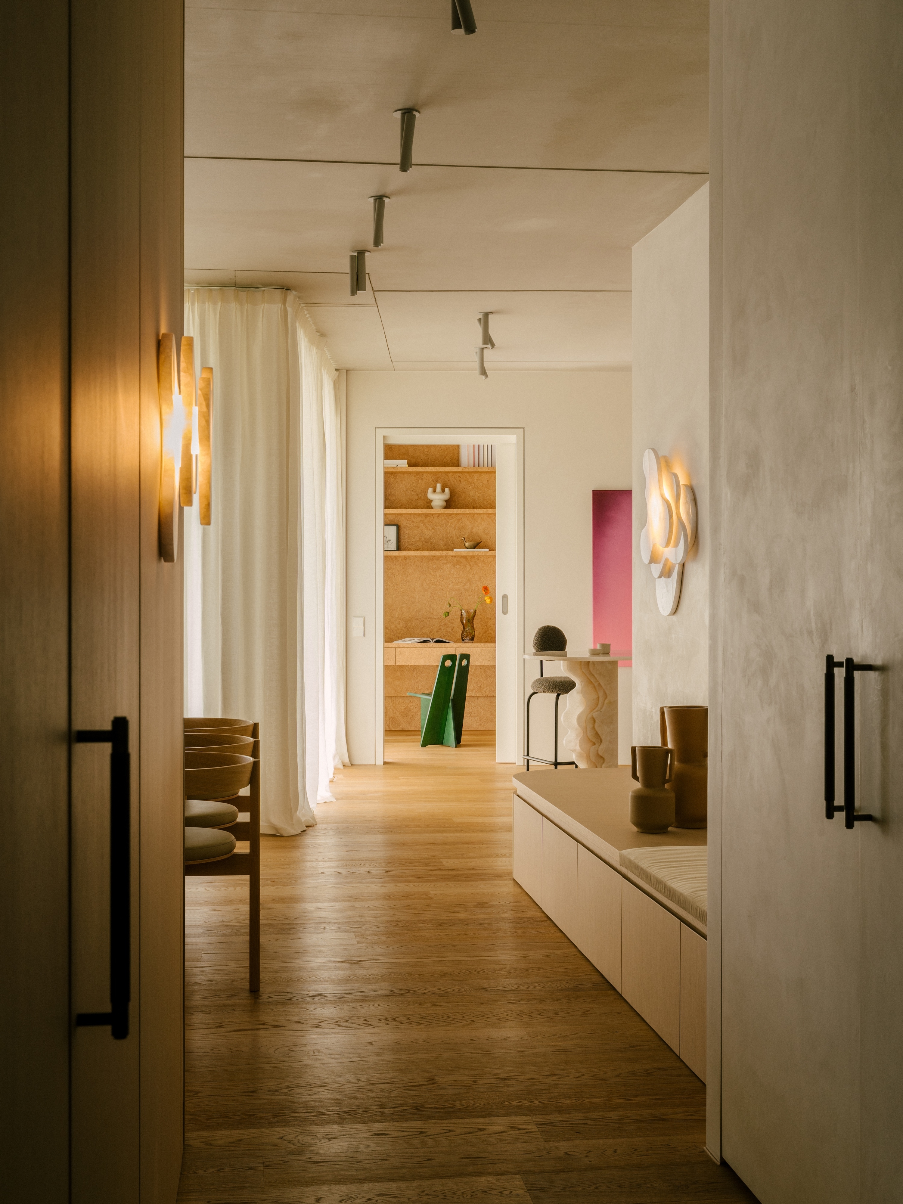 The kitchen stands out with its warm nutmeg Poliform design and sculptural quartzite elements, including a table leg and bespoke wall lamps. A vibrant pink gradient painting by Peter-Maximilian Ronsdorf adds a bold touch. The office area features a custom burl wood veneer desk paired with a vintage chair, while the bedroom boasts serene custom-made green glass side tables and luxurious lounge seating.