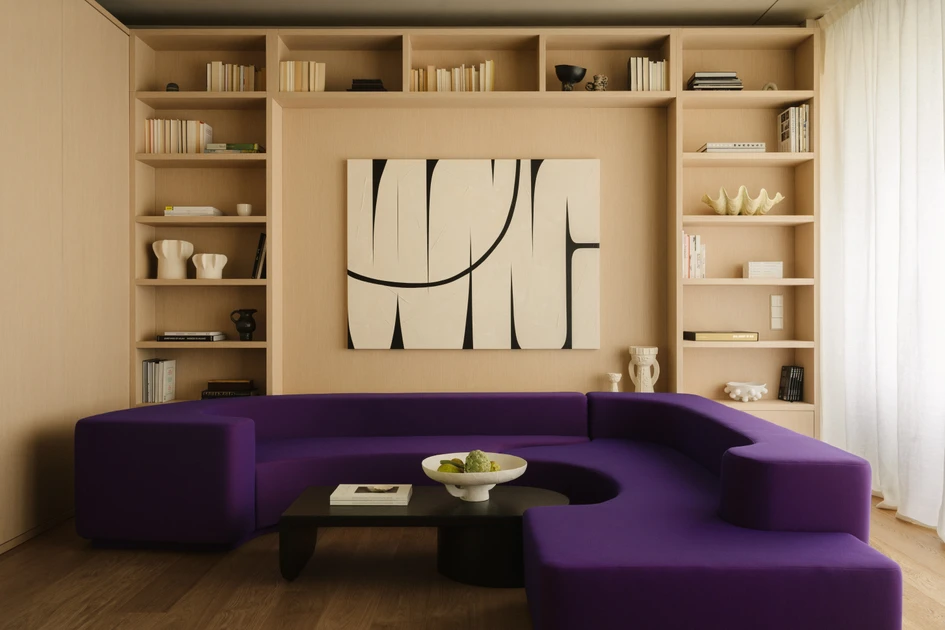 At the heart of the design is a custom wooden structure that wraps around the apartment, from the corridor to the living room. This feature integrates storage, conceals the television, hides bathroom doors, and culminates in a striking library wall—a dynamic display for the family’s books, art, and sculptural objects. The design merges functionality with artistry, reflecting the family's love for both literature and design.