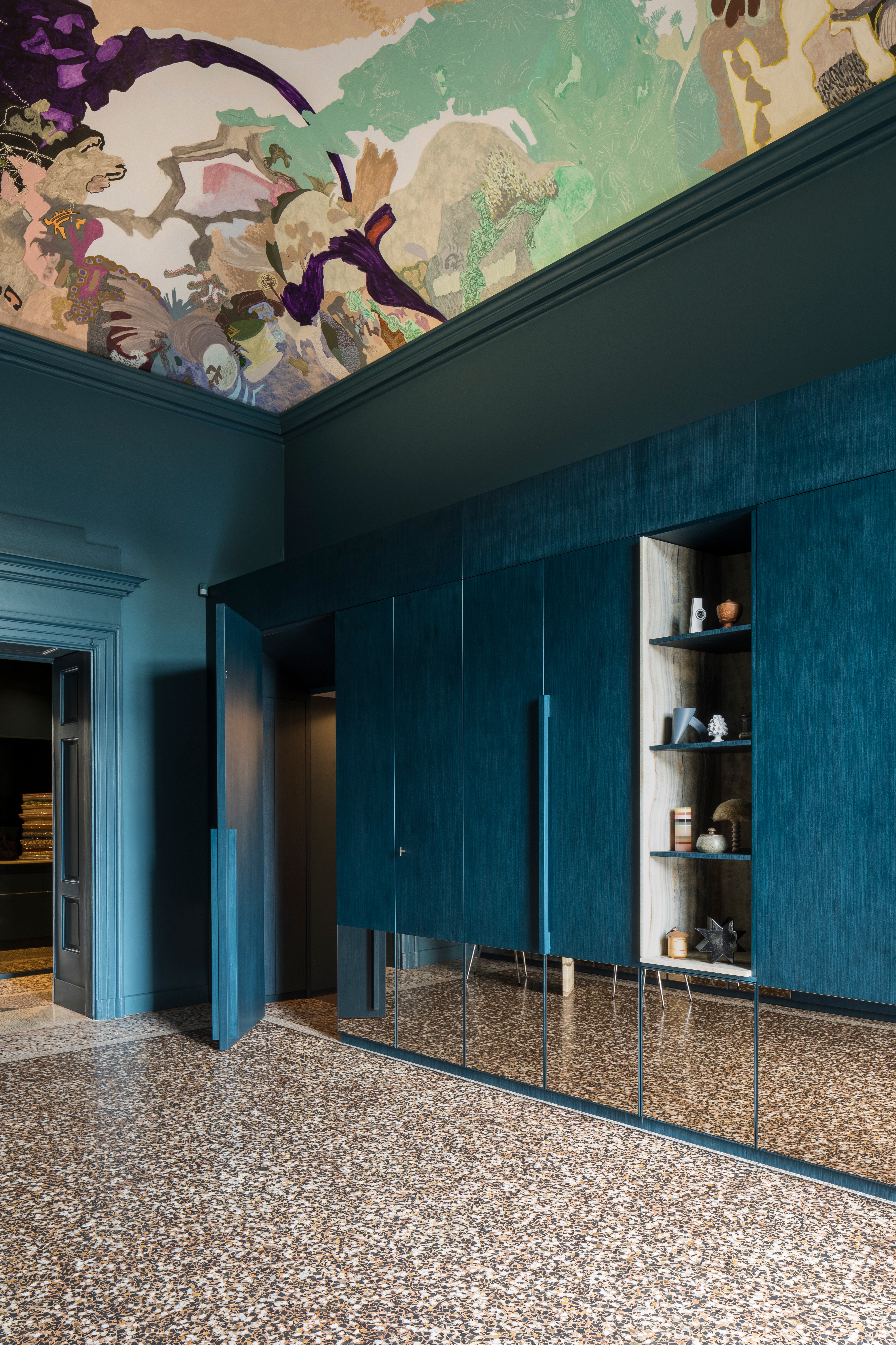The entrance, in which the octanium colour of the walls enhances by contrast the brilliant abstract polychrome fresco by the artist Victoria Stoian, leads to the daytime rooms of the large living and dining areas, both covered by large vaults painted with decorations that have undergone careful restoration.