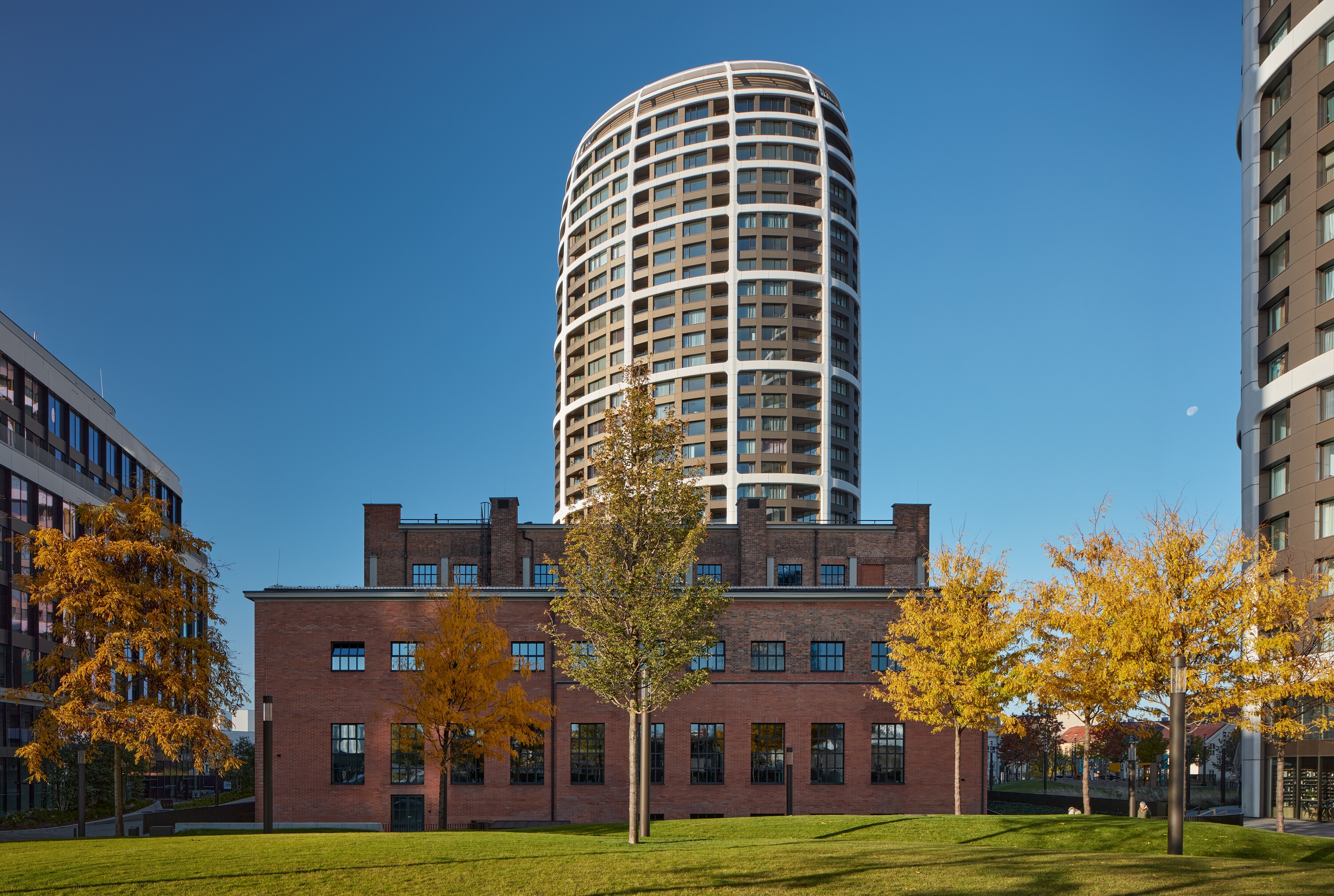 DF Creative Group placed a new five-storey building in the interior of the boiler and turbine hall, which created new areas. Their architectural solution uses the free internal space in the boiler and turbine halls to incorporate new independent structures. This concept makes it possible to clearly separate and distinguish the historic structures from the new ones. Other industrial elements of the heating plant were also used to pay homage to history – the entire interior is dominated by concrete hoppers, with the original crane forming the atypical open ceiling of the shared office.