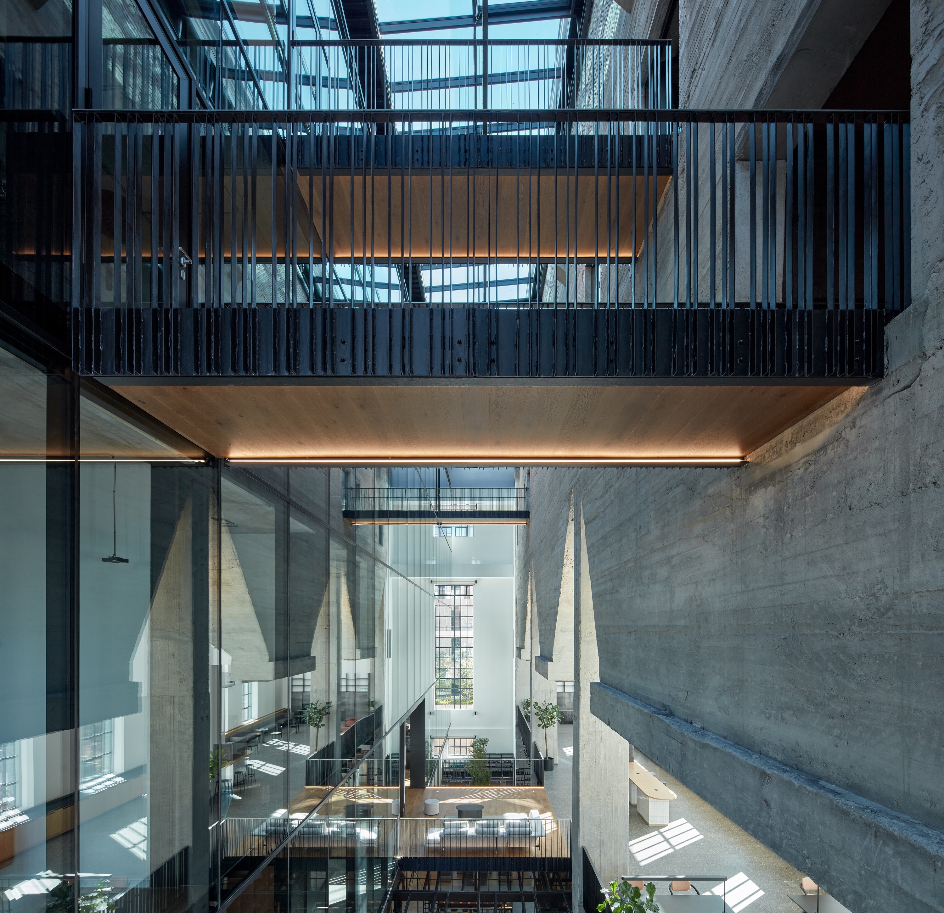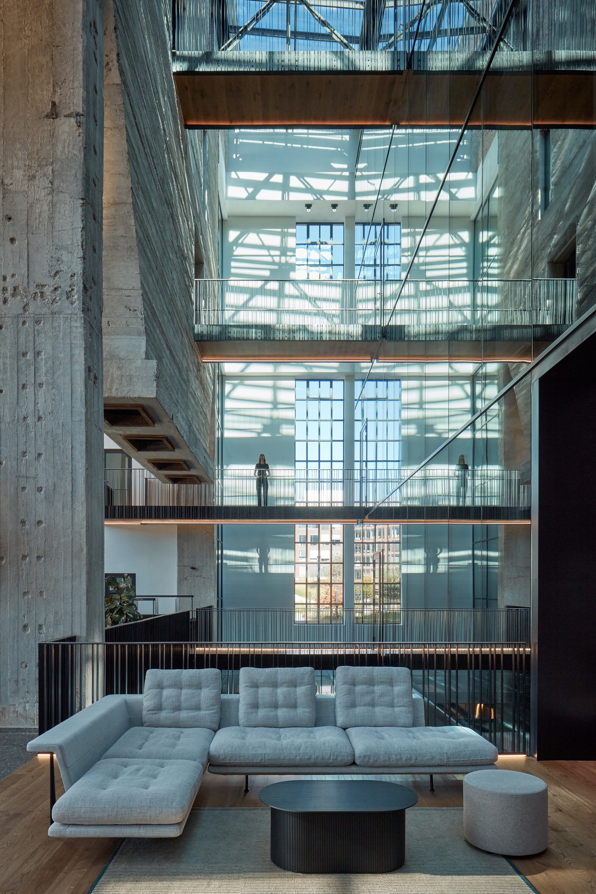 The generosity of the space is underlined by the massive concrete hoppers, which were originally used to store solid fuels. The architects managed to place some of the meeting rooms inside them. The most popular for users so far seems to be the two meeting rooms on the fifth floor. “This is where we took advantage of the location and experimented with glazing in parts of the floor. The result is an iconic space that everyone wants to see. Even those who are afraid of heights,” says architect Antal.