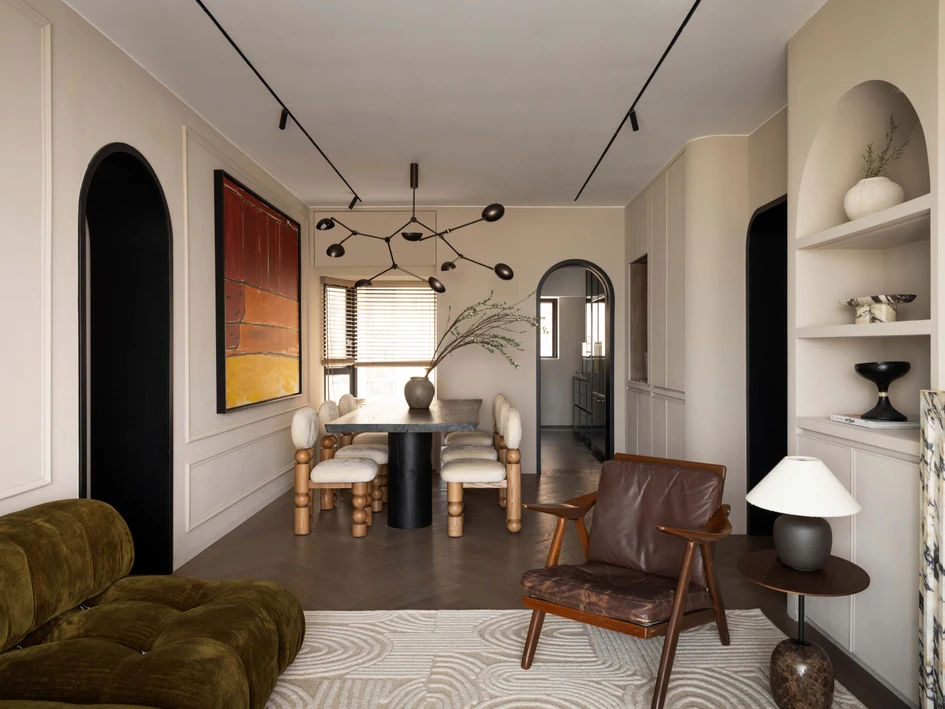 Archways and portals is a strong motif in the apartment. Upon entering the apartment, one is greeted by a large black wooden architrave that separates the entry vestibule from the living room and dining room.