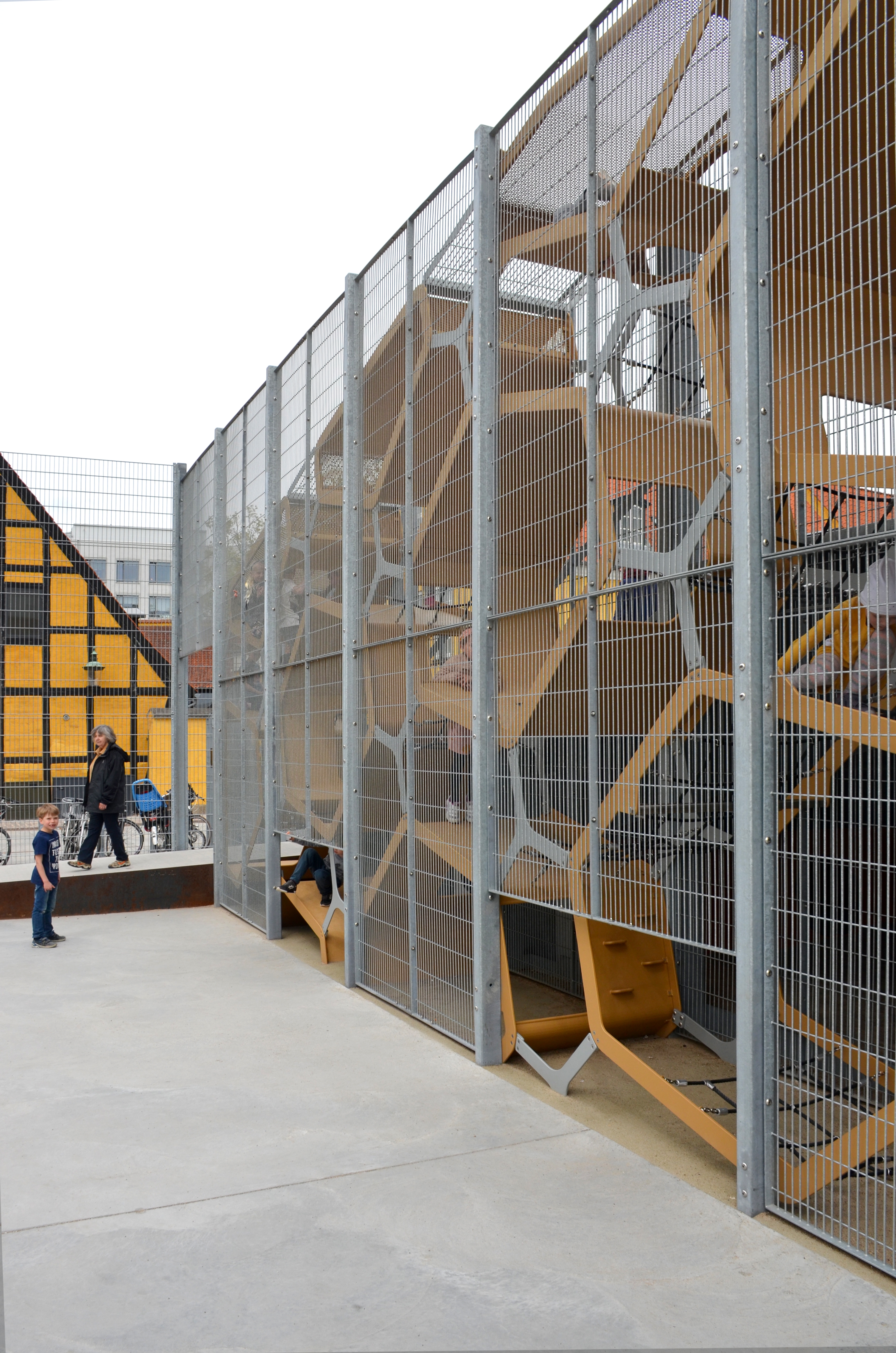 The vertical play element, wedged in between the tribune and the sports field, is a 3D maze consisting of honeycomb-shaped elements. It fits perfectly in the series of vertical play objects that carve has been renowned for. Also, this element allows for many children to play at the same time; the number of routes is endless. The upper part of the elements can be used for scaling and sliding. The honeycomb elements take on the ochre color of the surrounding buildings, whose yellow plastered facades are so typical for Danish housing.