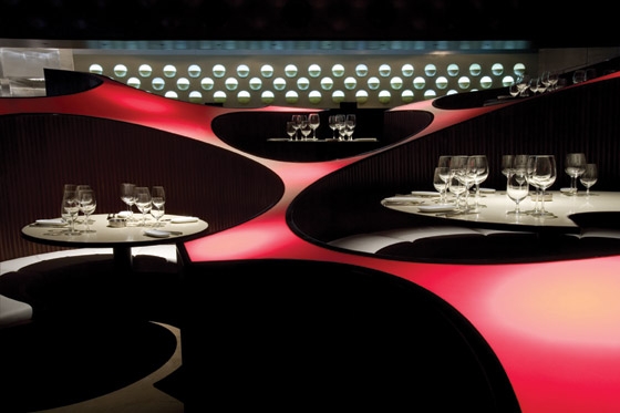 At Blue Frog, when the architect showed us the initial elevation, we saw the whole nodal structure of the seating as one big light fi xture—tying the whole space together. The Blue Frog Lounge combines a performance space, dining space, dance fl oor, and recording studios within a renovated factory space in the heart of Mumbai. Cylindrical dining booths in the main performance area are carved from an undulating expanse of stepped wood frame, the surface of which is topped with translucent plexiglass and illuminated from beneath with LED’s. The result is a web of color-changing semicircles that delineate the individual dining areas and set the tone for whatever function is emphasized in the space at the moment. Red illumination sparks energy and intensifies a performance, while blue illumination sets a low key, cool atmosphere in tune with the musical style. White illumination adds elegance to more intimate dining situations. This fl exible, theatrical scheme turns traditional stage lighting upside-down as it brings the focus onto the audience as well as the performers.