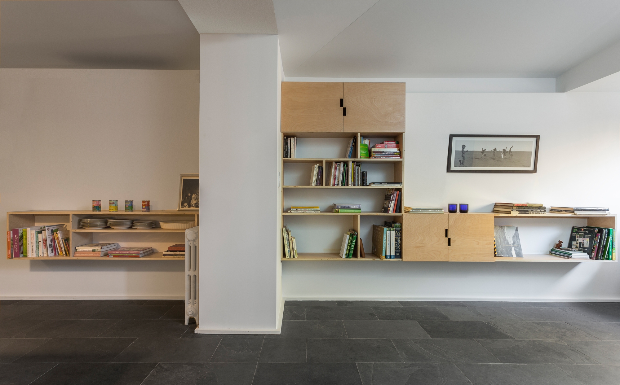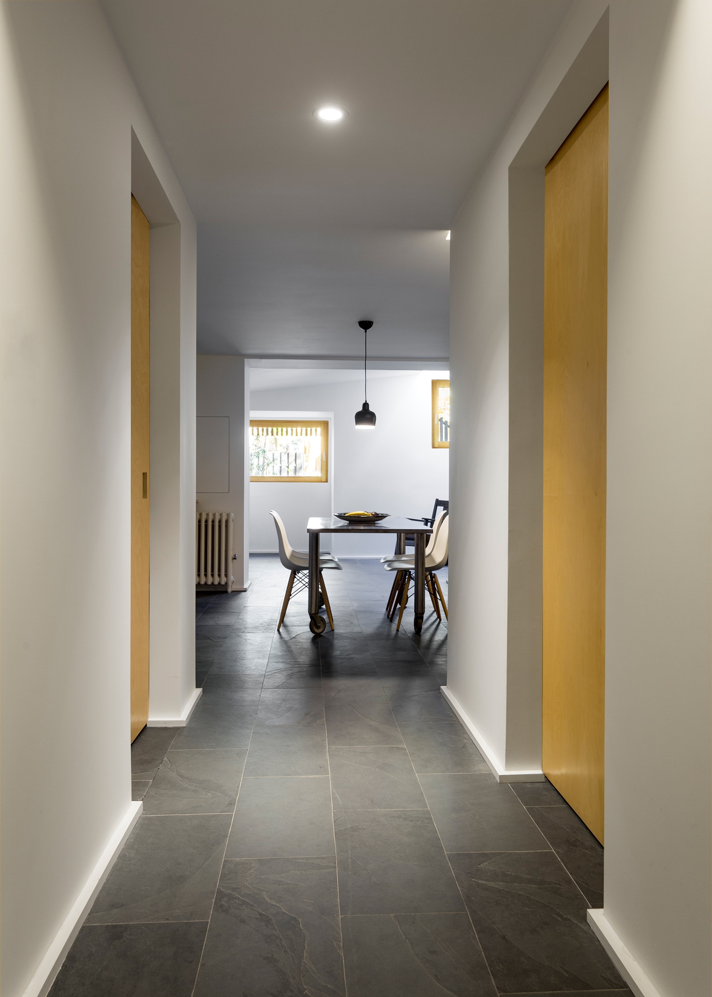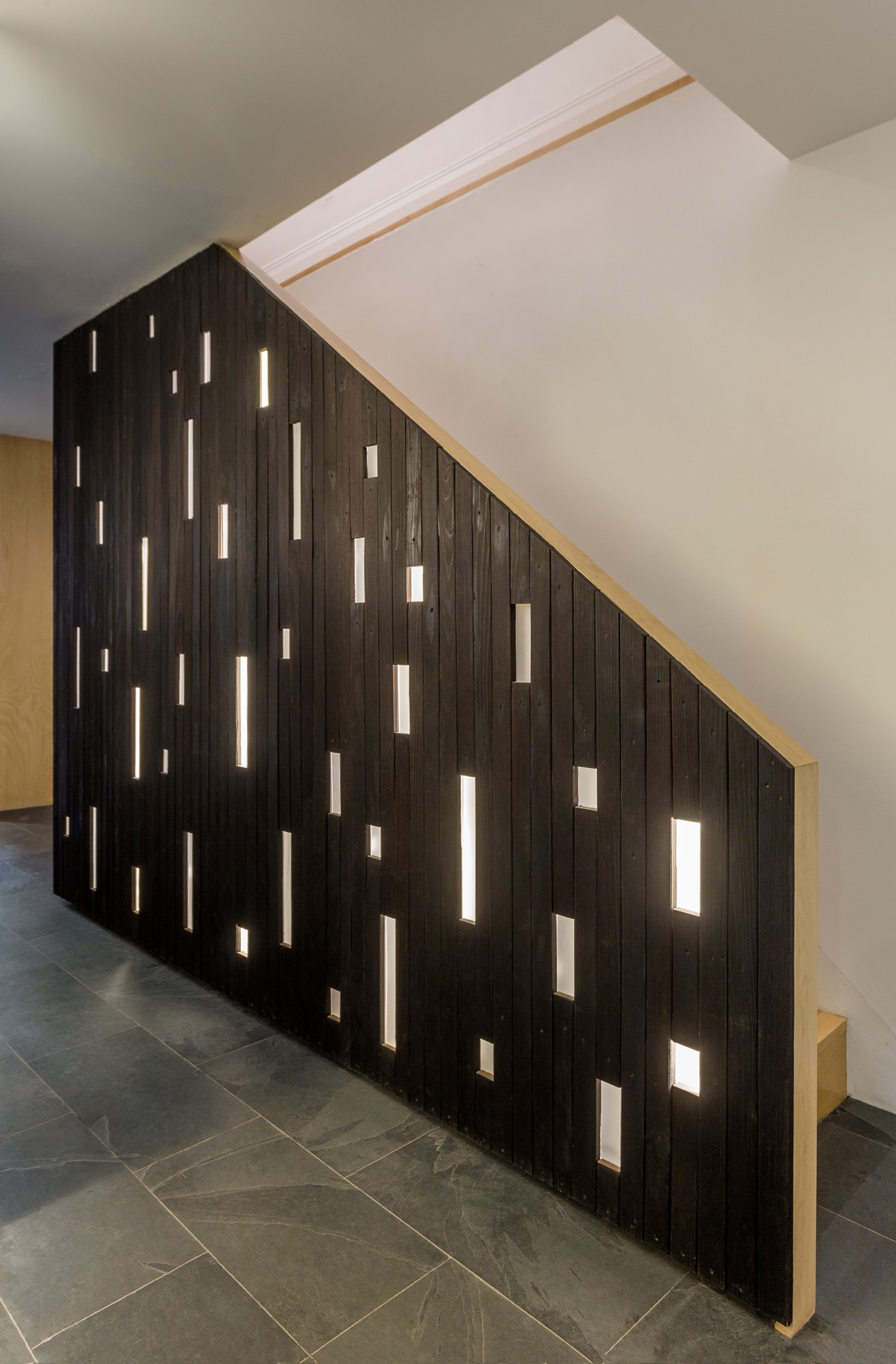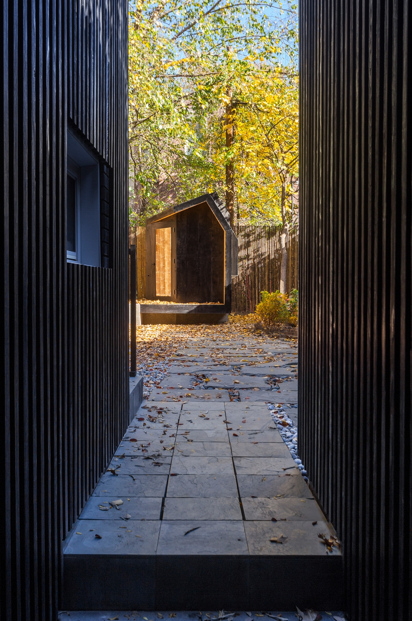 The exterior cladding is achieved layering vertical wooden slats of Shou Sugi Ban (or Yakisugi), an ancient Japanese exterior siding technique that preserves wood by charring. The two volumes are devoted to sound/vision and smelling/tasting activities and they complement the existing functions with natural light being the main component of the white bare interiors minimally furnished.