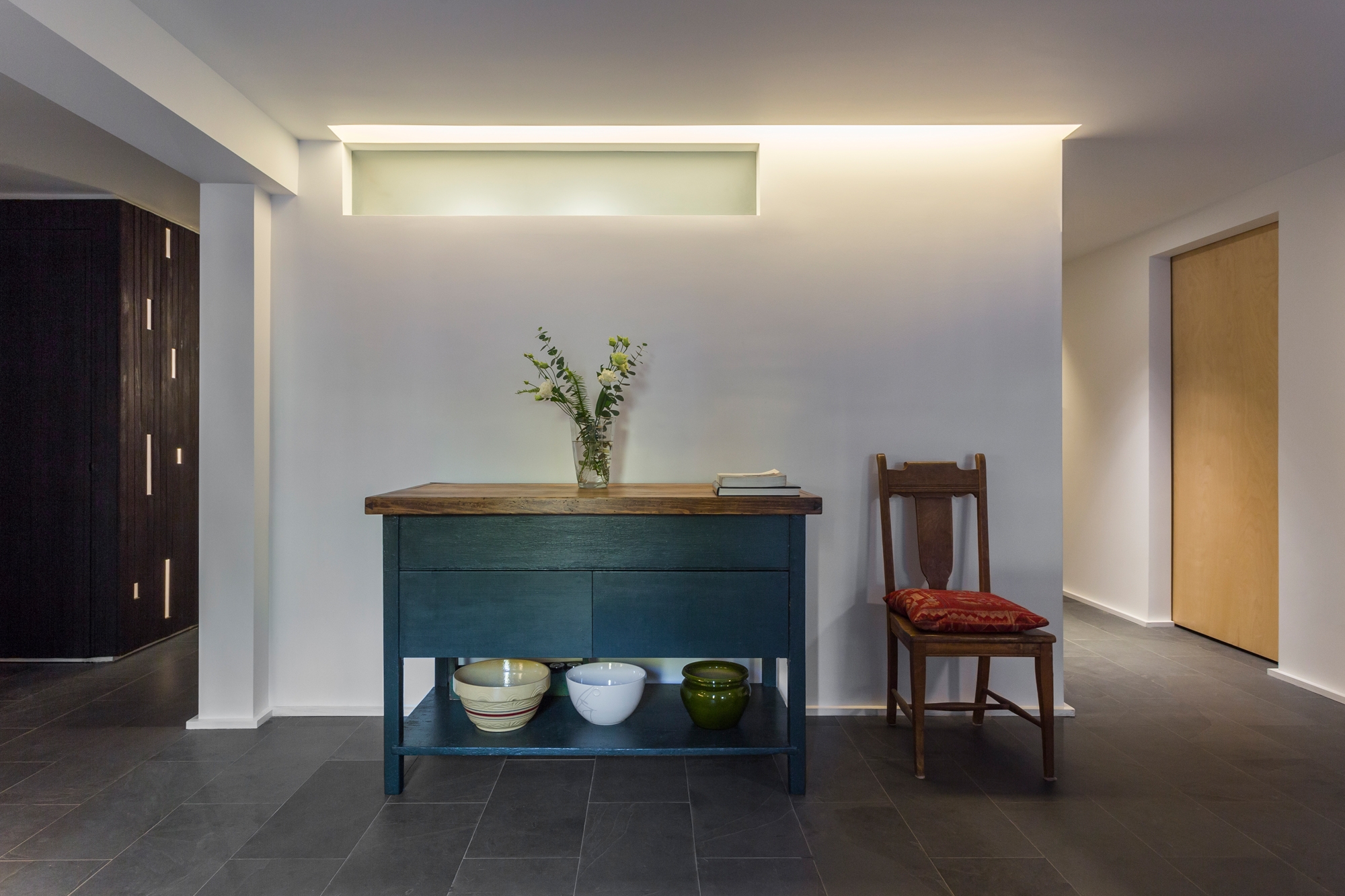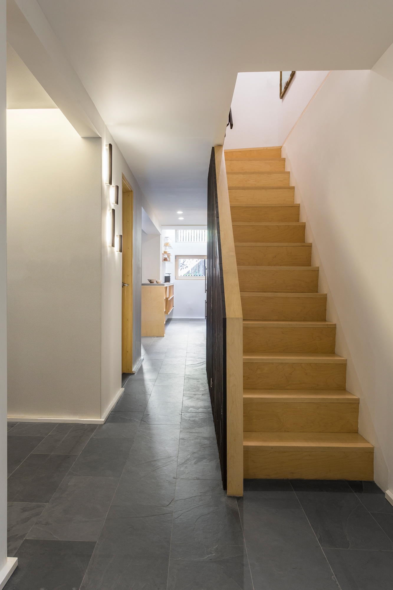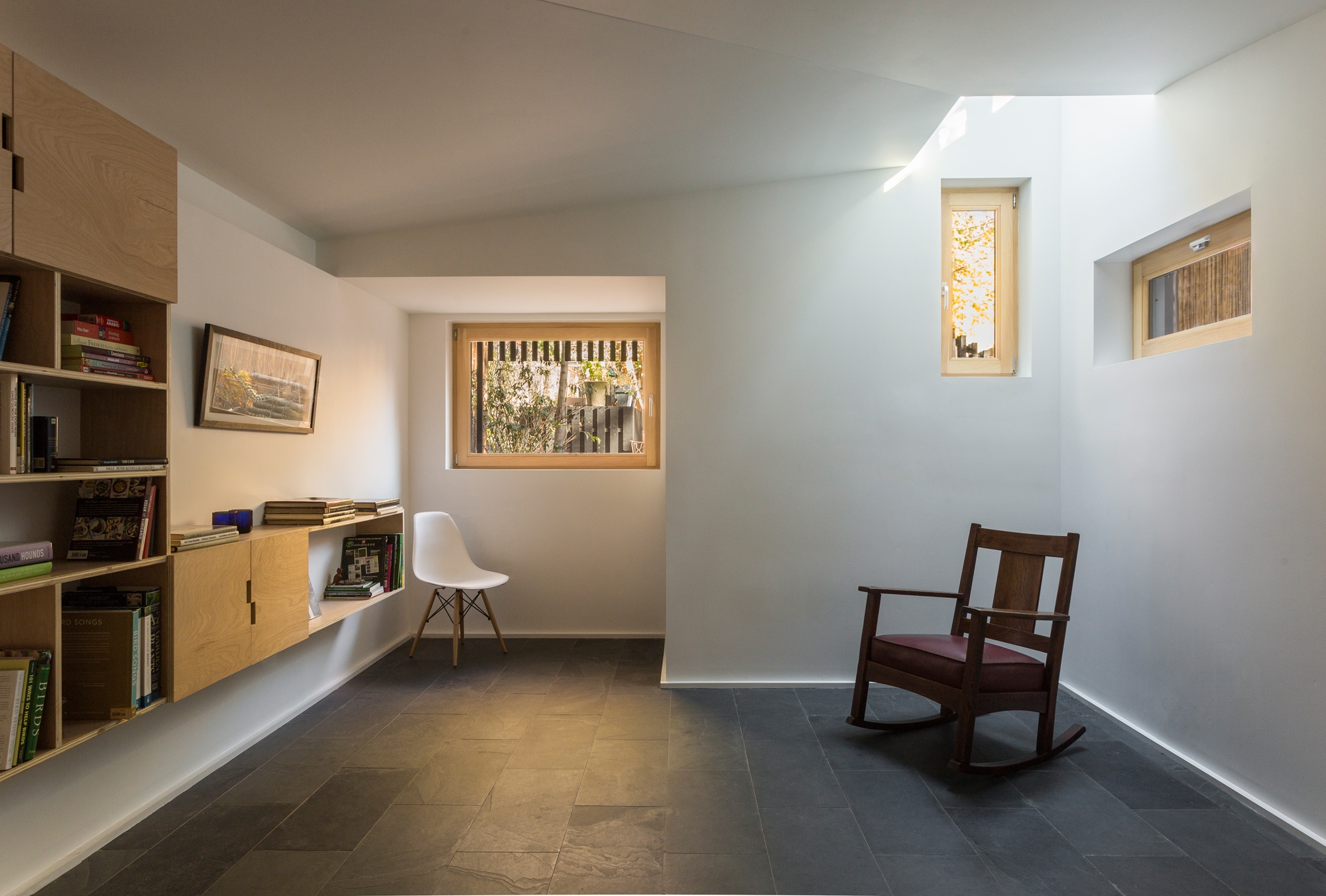 The experience is extended to the landscape outside where the original bluestones have been restored and reused as the material for the hardscape that leads the user to a third volume: a shed-like typology balloon frame construction. This third programmatic element is providing the function of isolation for meditative activities and it serves as a winter plants shelter for the garden. The sectional shape of the three pavilions revolve around the presence of skylights with different configurations that capture the sun and the diffused light reflecting from the trees, making the interior changing with the seasons and further connecting with the exterior.