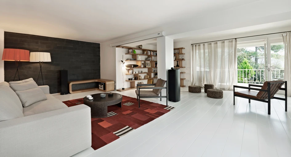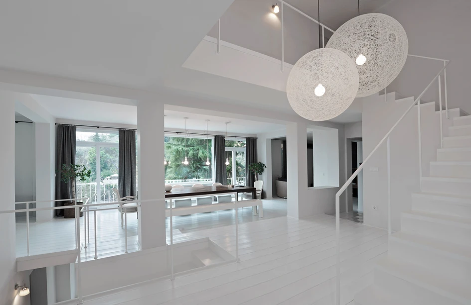 It is designed as an all white house full of light, with some iconic modern furniture. The first floor acts as a living area while the ground floor is a cosy nest for a guest. White painted wooden laths continue all around the house, reminding the old Istanbul Bosphorus houses, while creating a sleek, clean, continuous environment. White staircases almost disappear in the total whiteness and simpleness. On the other hand the kitchenette and the shower/wc cabin on the ground floor pops out.