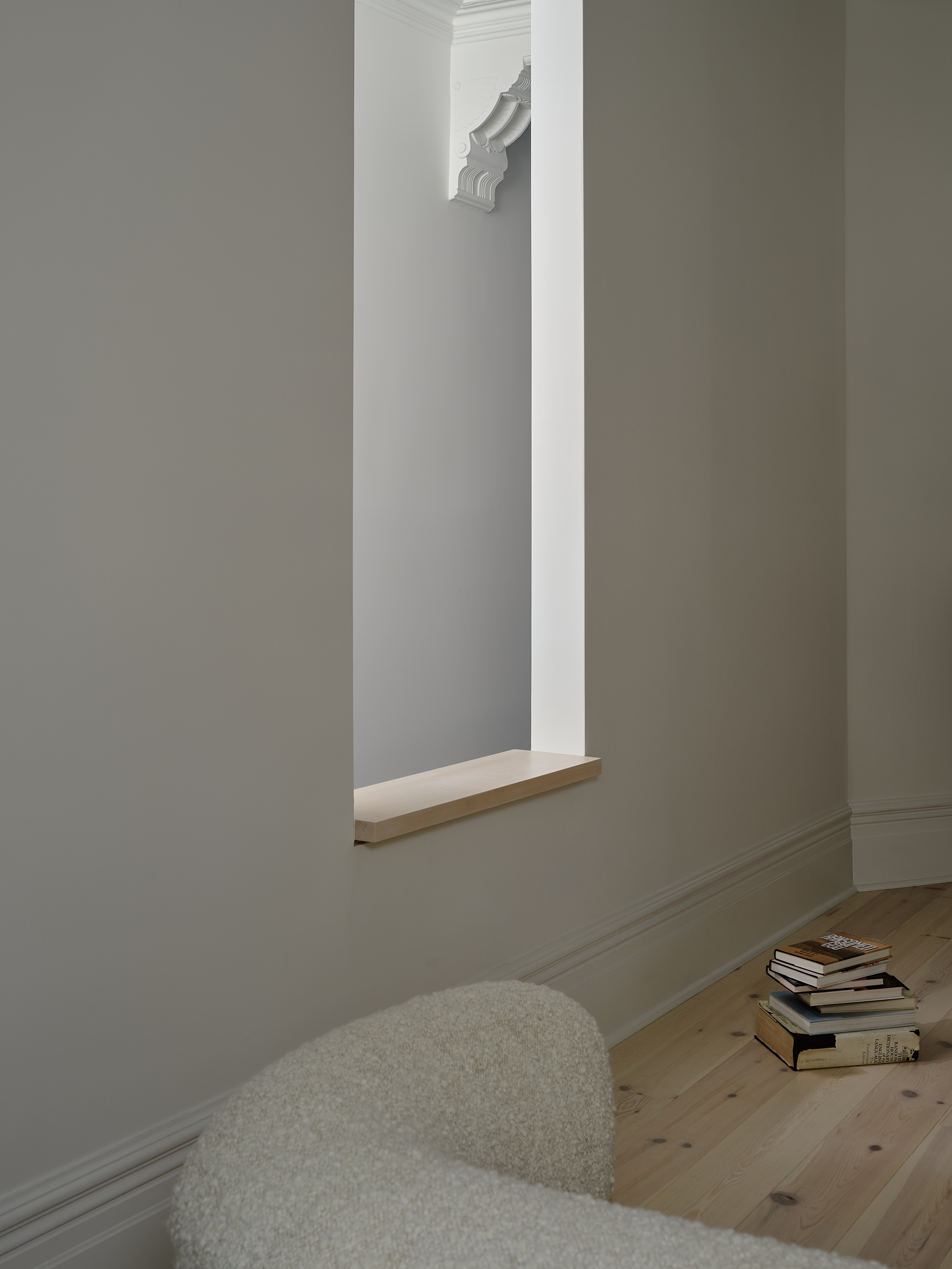 The result is neither old nor new, but rather a blurring of the two - the retained historic elements puzzled together between the modern interventions: an original molding peeking through an unexpected incision, or caught in reflection, has the effect of at once preserving and dismantling the elements of what was once a familiar Victorian. The colours and materials are redolent of a Victorian home, but have been renewed by contemporary building technology. New light plays with redolent shadows – all re-framing the inhabitants’ experience of their home in a way that is both inherently familiar, yet simultaneously unexpected.