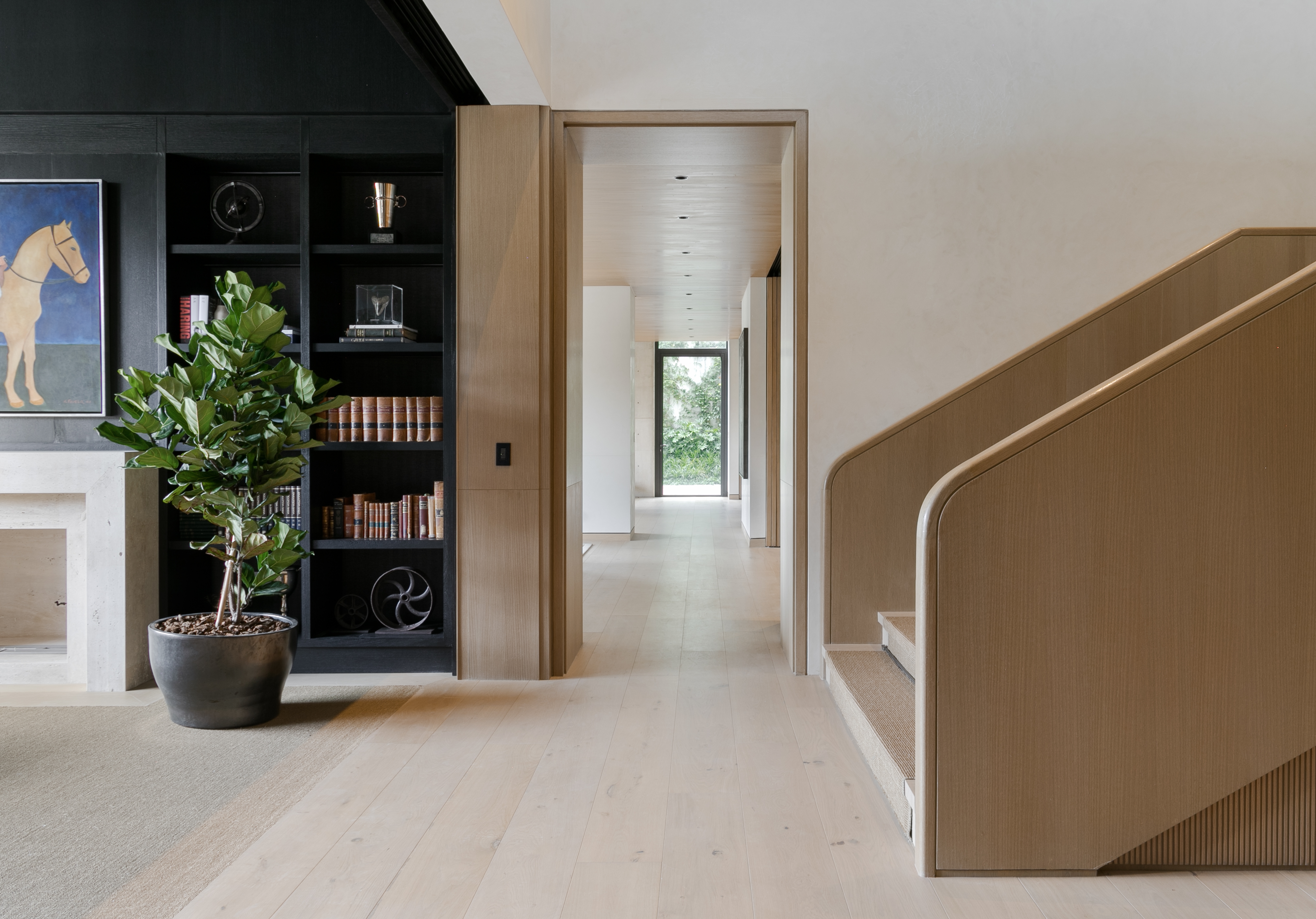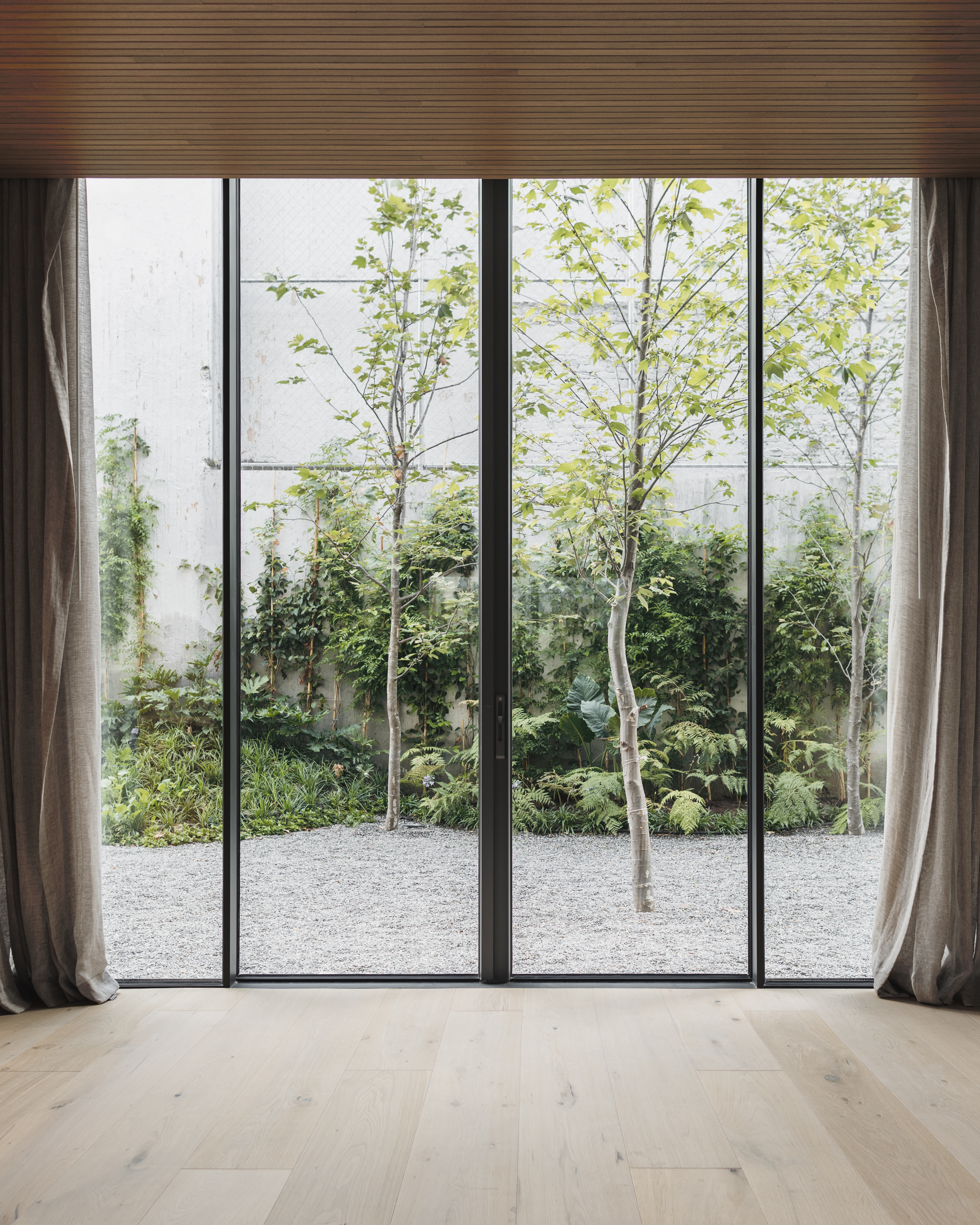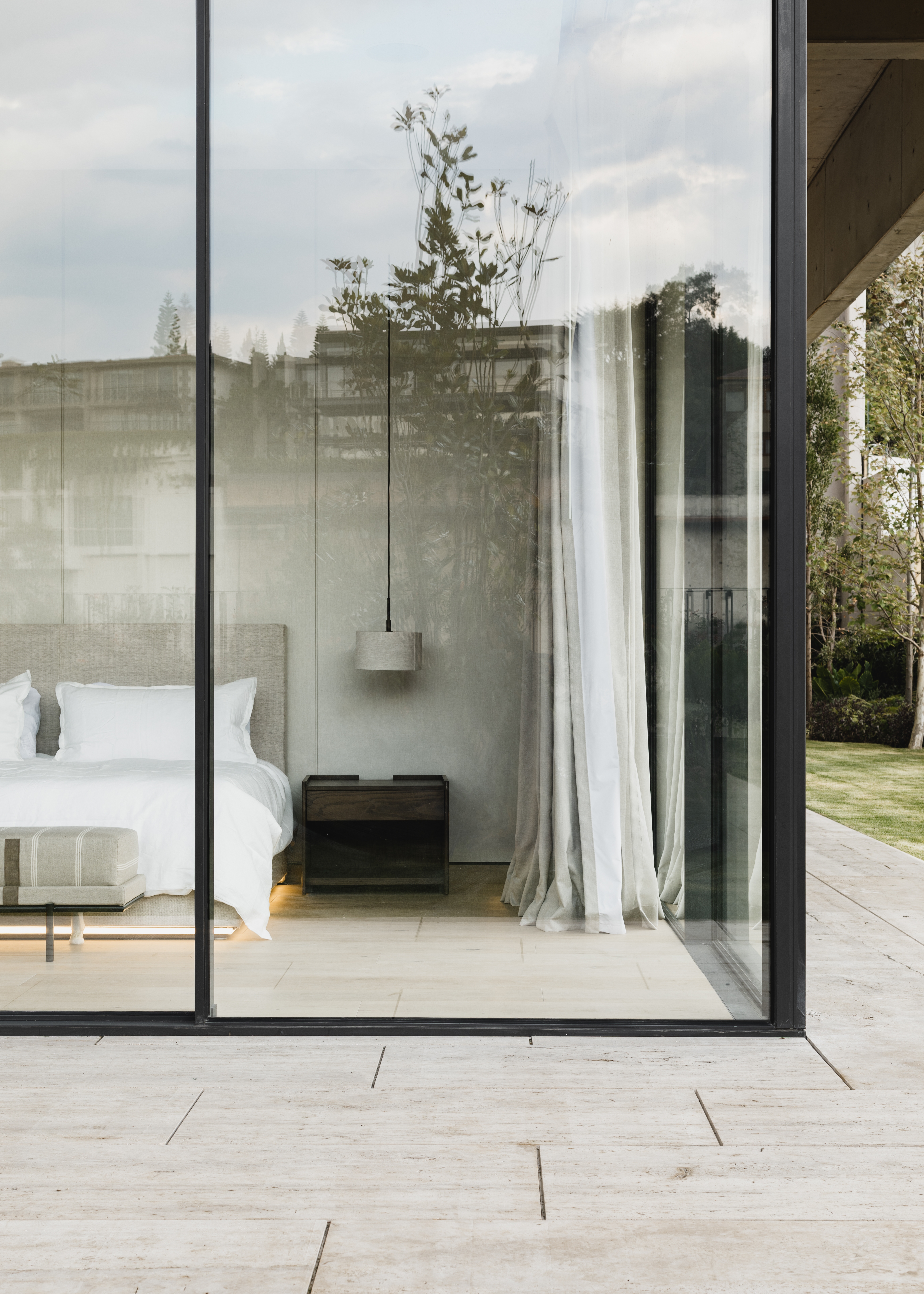 The main access consists of a sculptural wooden staircase that goes down to a study that adjoins the terrace and the garden. On this level, there is a double-height gallery that vestibules the private area of the house. The structural columns that surround the gallery mark the accesses to the bedrooms that adjoin the side garden of the house.