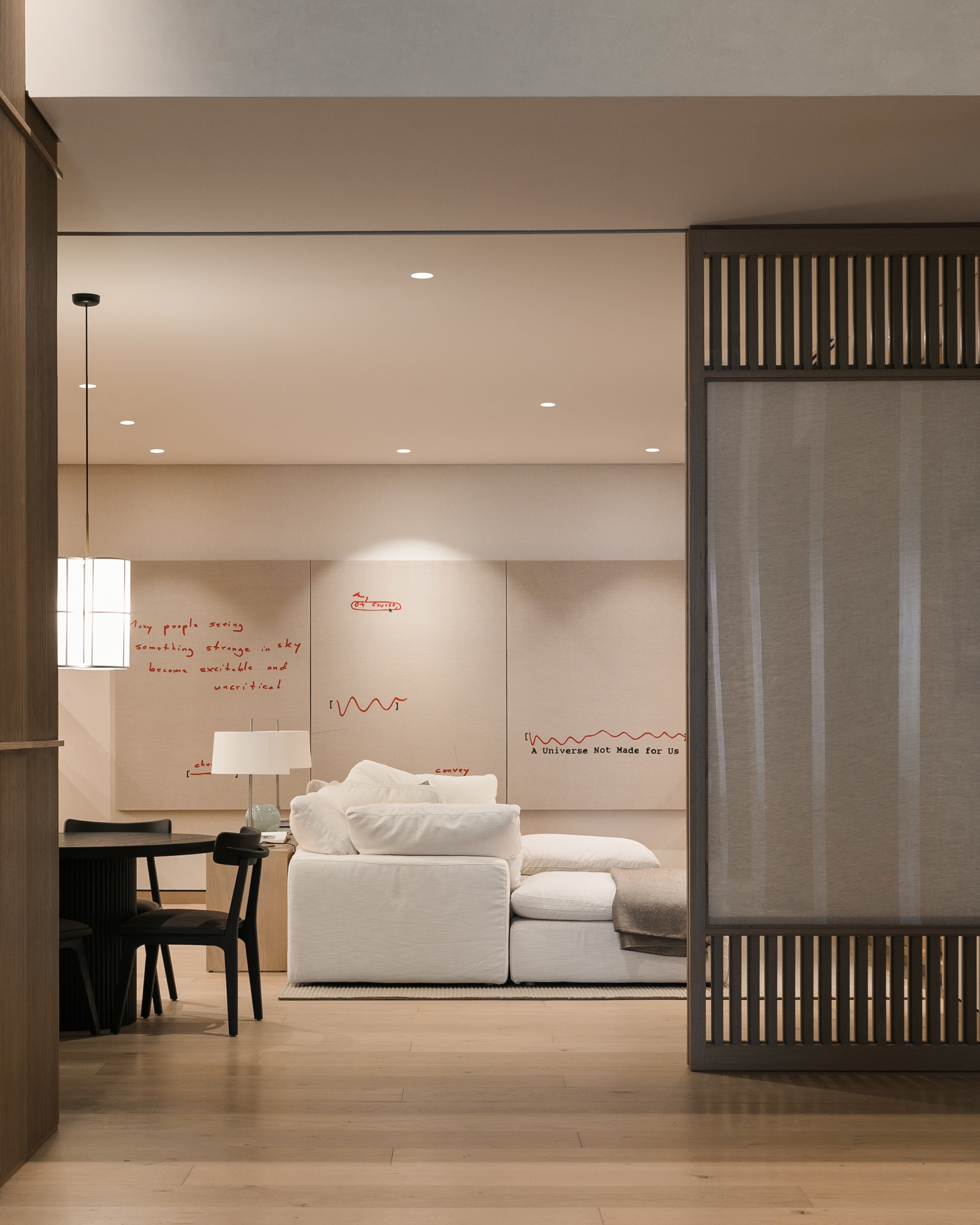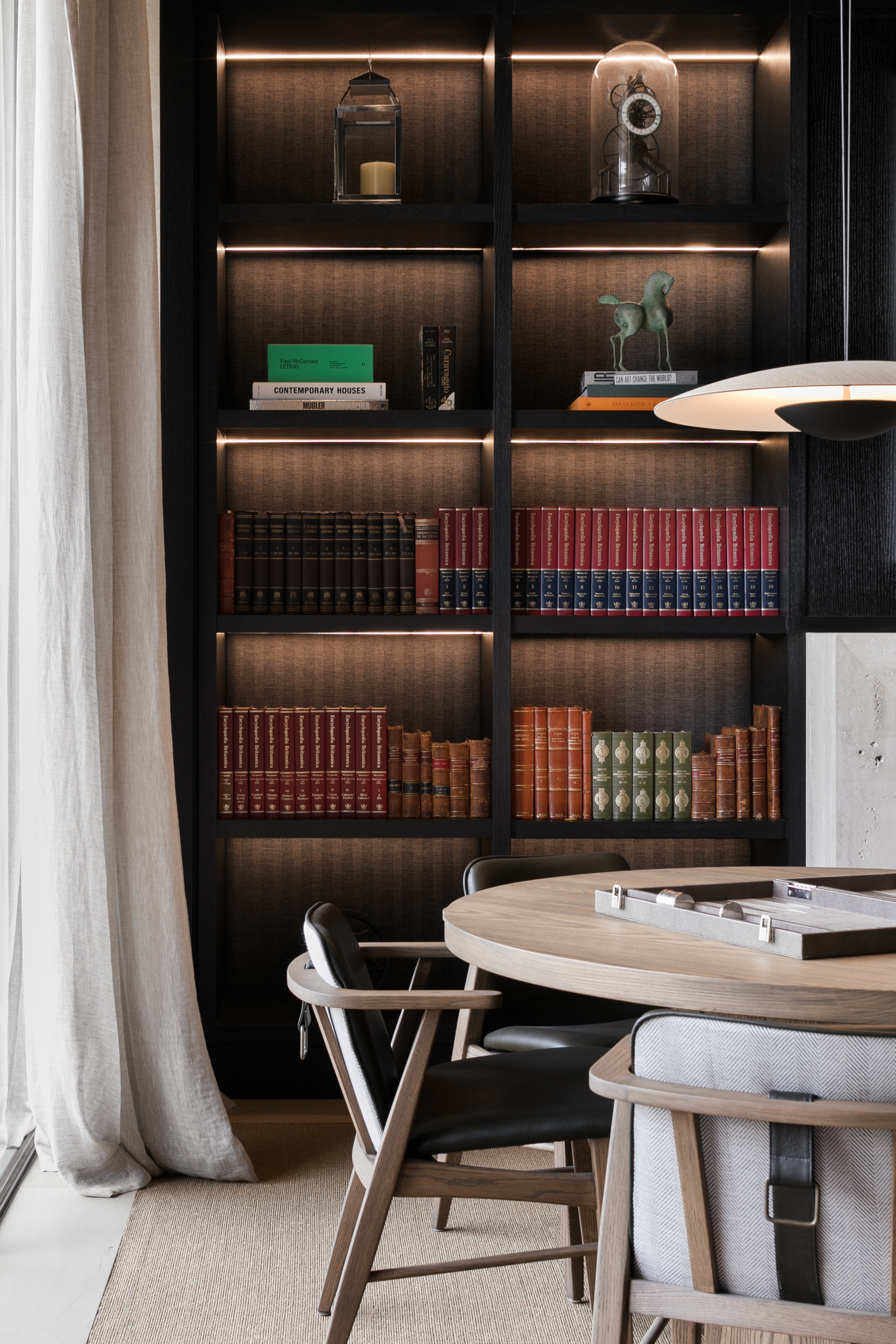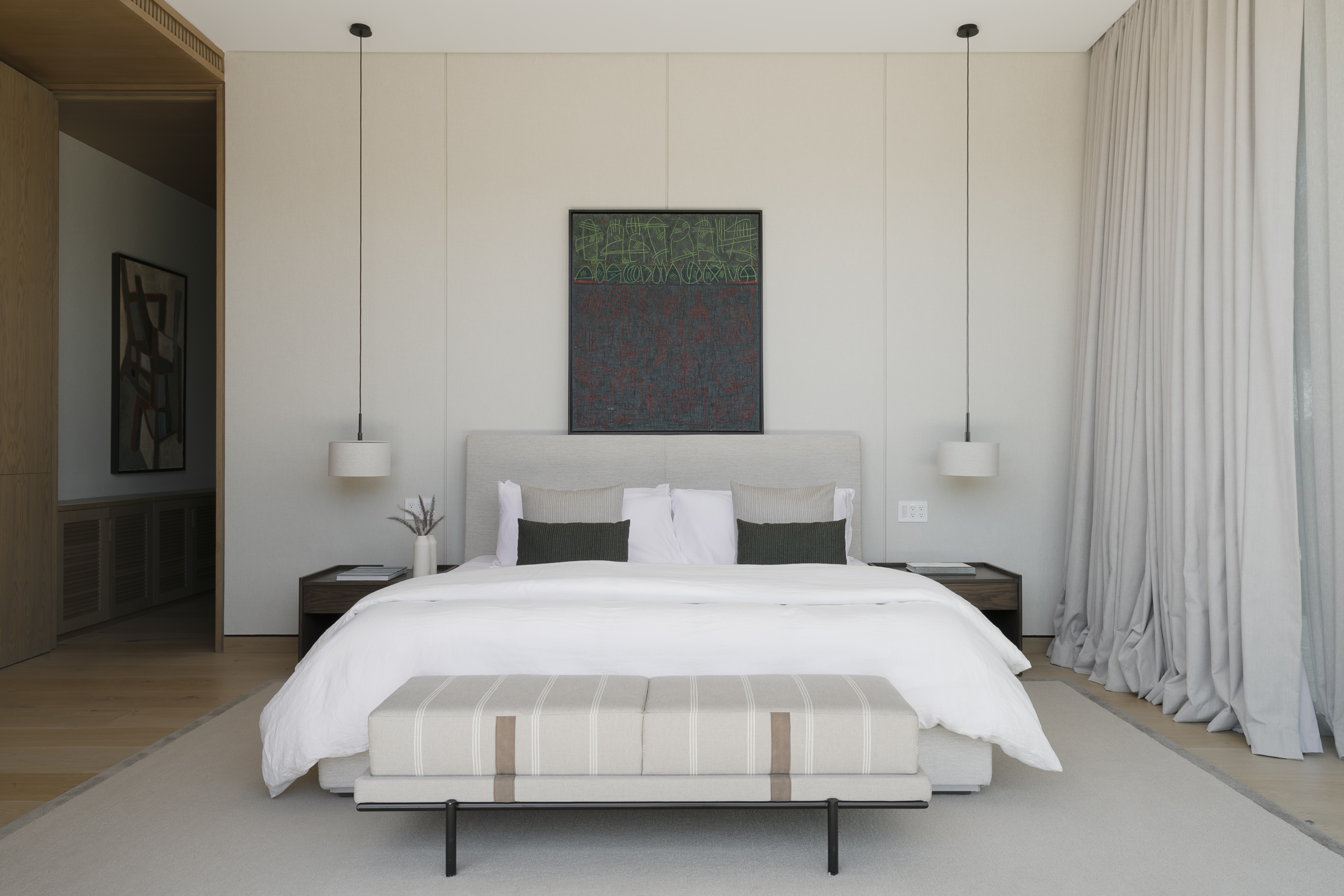 The main access consists of a sculptural wooden staircase that goes down to a study that adjoins the terrace and the garden. On this level, there is a double-height gallery that vestibules the private area of the house. The structural columns that surround the gallery mark the accesses to the bedrooms that adjoin the side garden of the house.