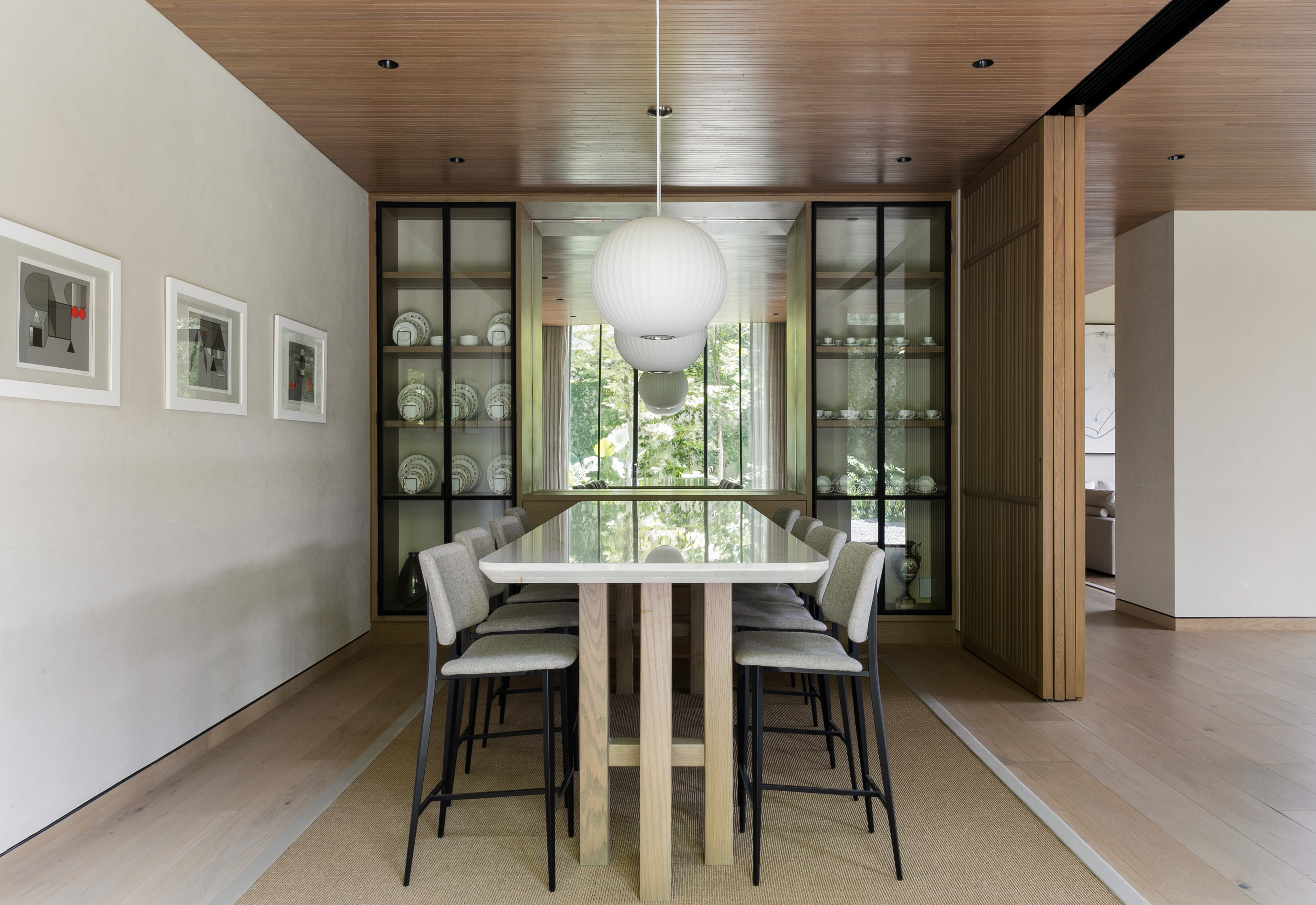 On the opposite side of the gallery passing through the studio, the access to the public area of the house is found. The living room and dining room adjoin the terrace and garden. The sliding glass doors allow to open the space and connect the interior with the exterior of these spaces.