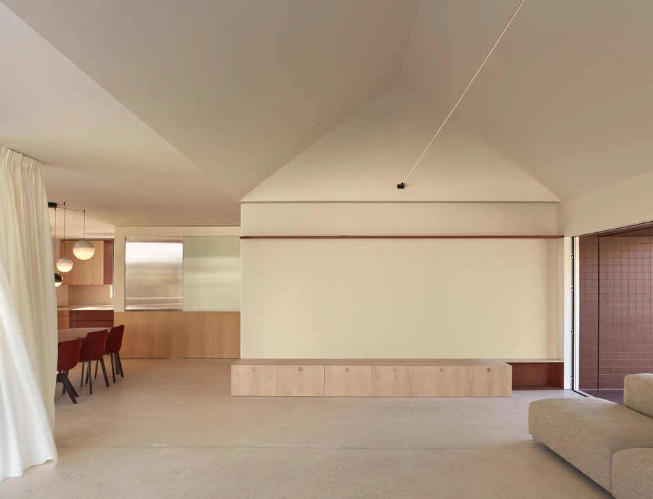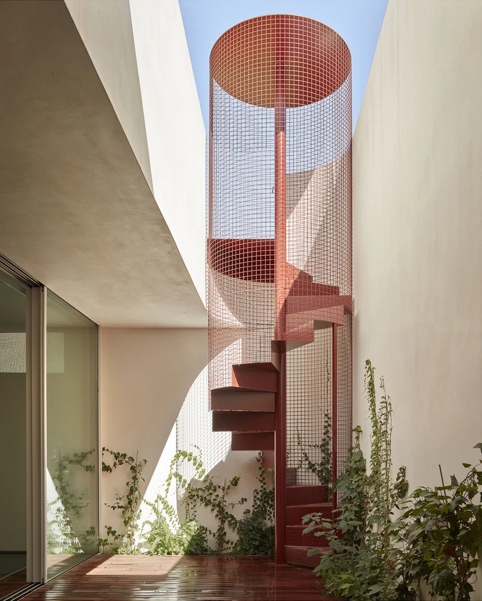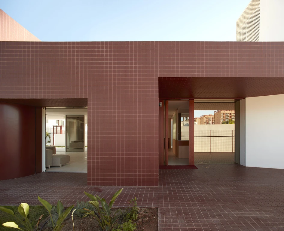 Materially, the house is proposed on the outside with a dialogue between a continuous white lime cladding and a ceramic canvas sized with 10x10 tiles that modulate its envelope and emphasize its geometry. Inside, both tones are combined in the continuous terrazzo that defines the public area of the ground floor and also in the dialogue of maple and cherry woods that resolve the furniture included in the architecture itself. The white tone understood as neutral, allows the reddish tones of the ceramic and the different greens of the vegetation to balance and enhance each other.