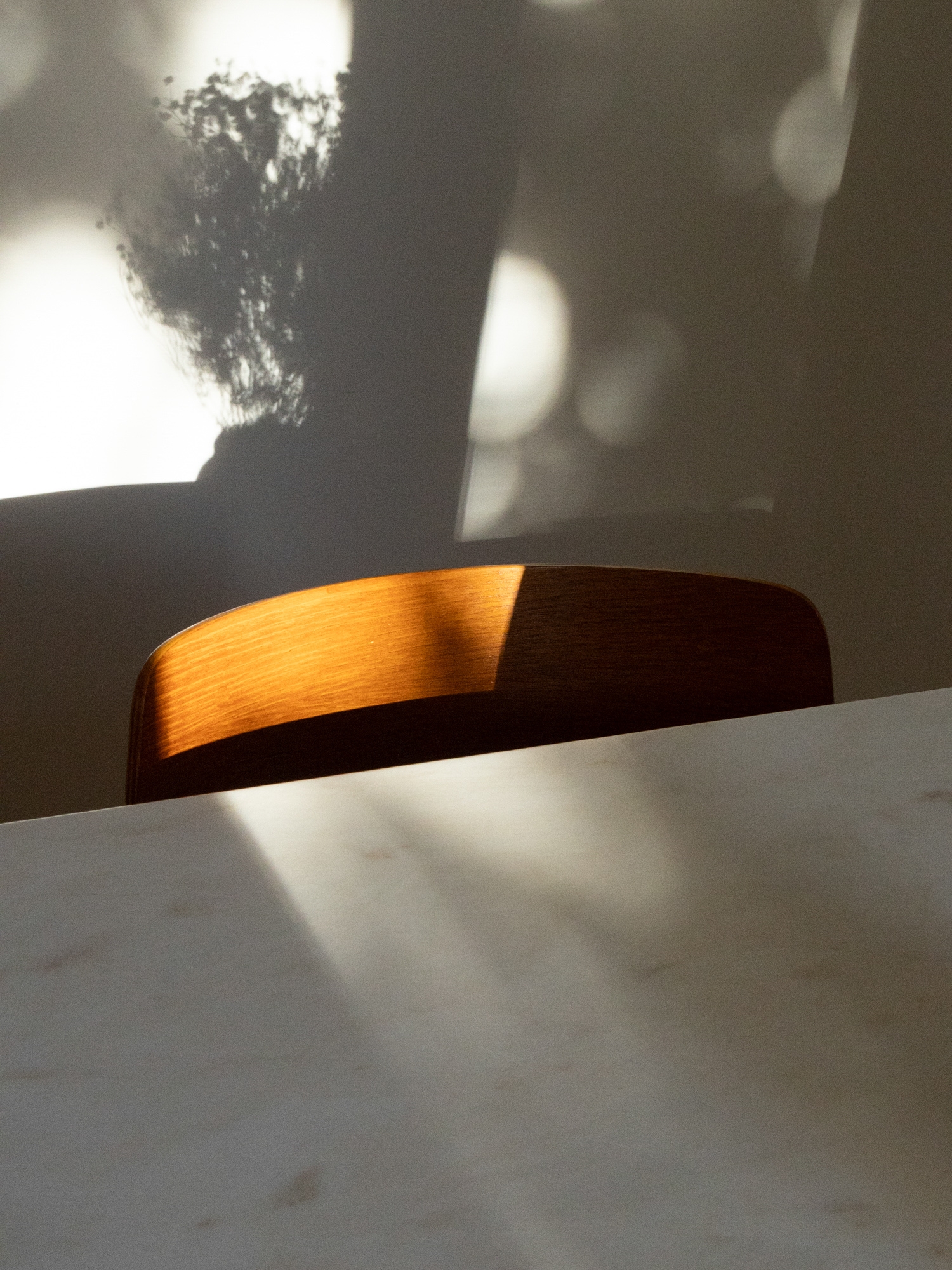 A load-bearing wall was removed to create a full-height opening, allowing the living room to flow seamlessly into an intimate dining room, where the custom-made Rosa Portugal marble dining table is the star of the show.